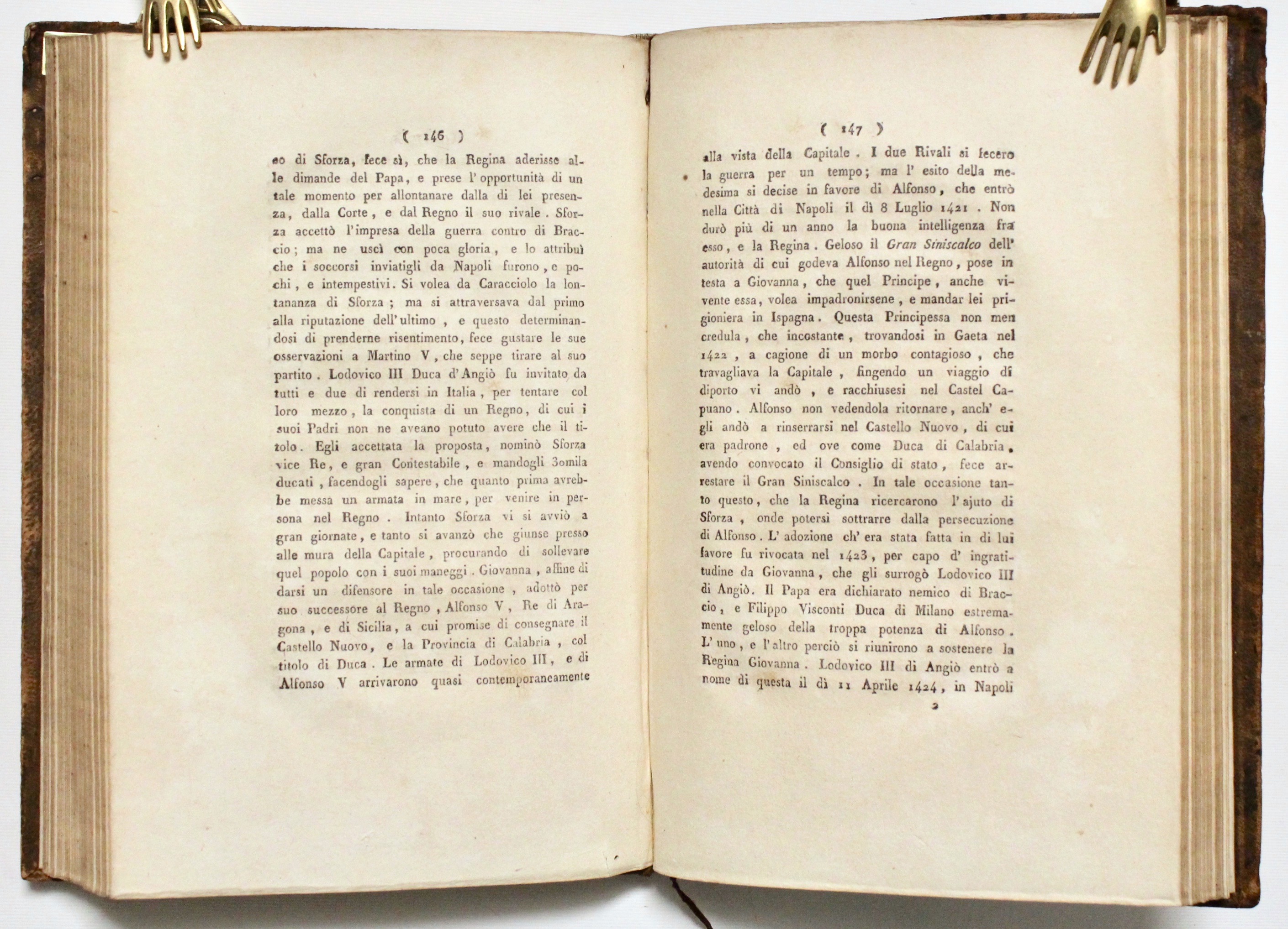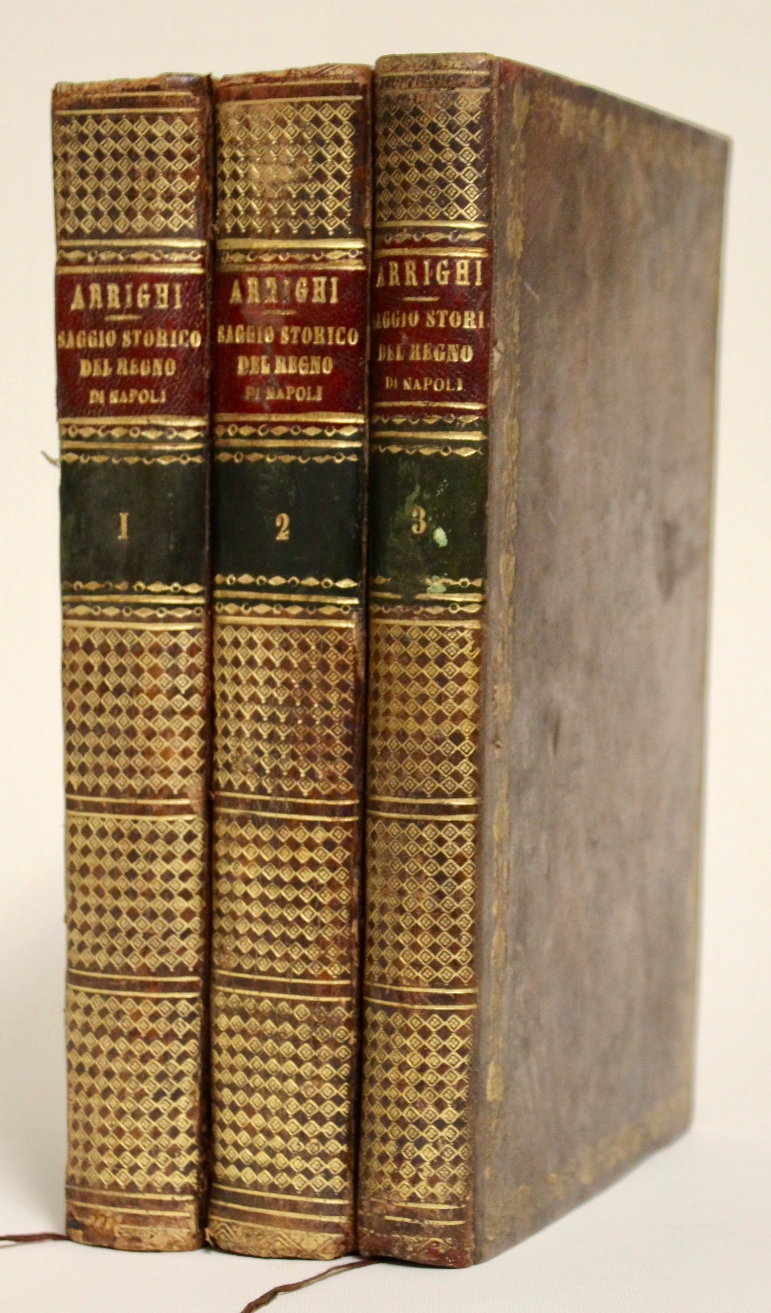 Rara opera che descrive la storia del Regno a partire dal longobardo ducato di Benevento fino al regno di ferdinando IV. Esemplare molto bello, con qualche fioritura al terzo volume e in genere lieve usura alla legatura a spigoli, cuffie.