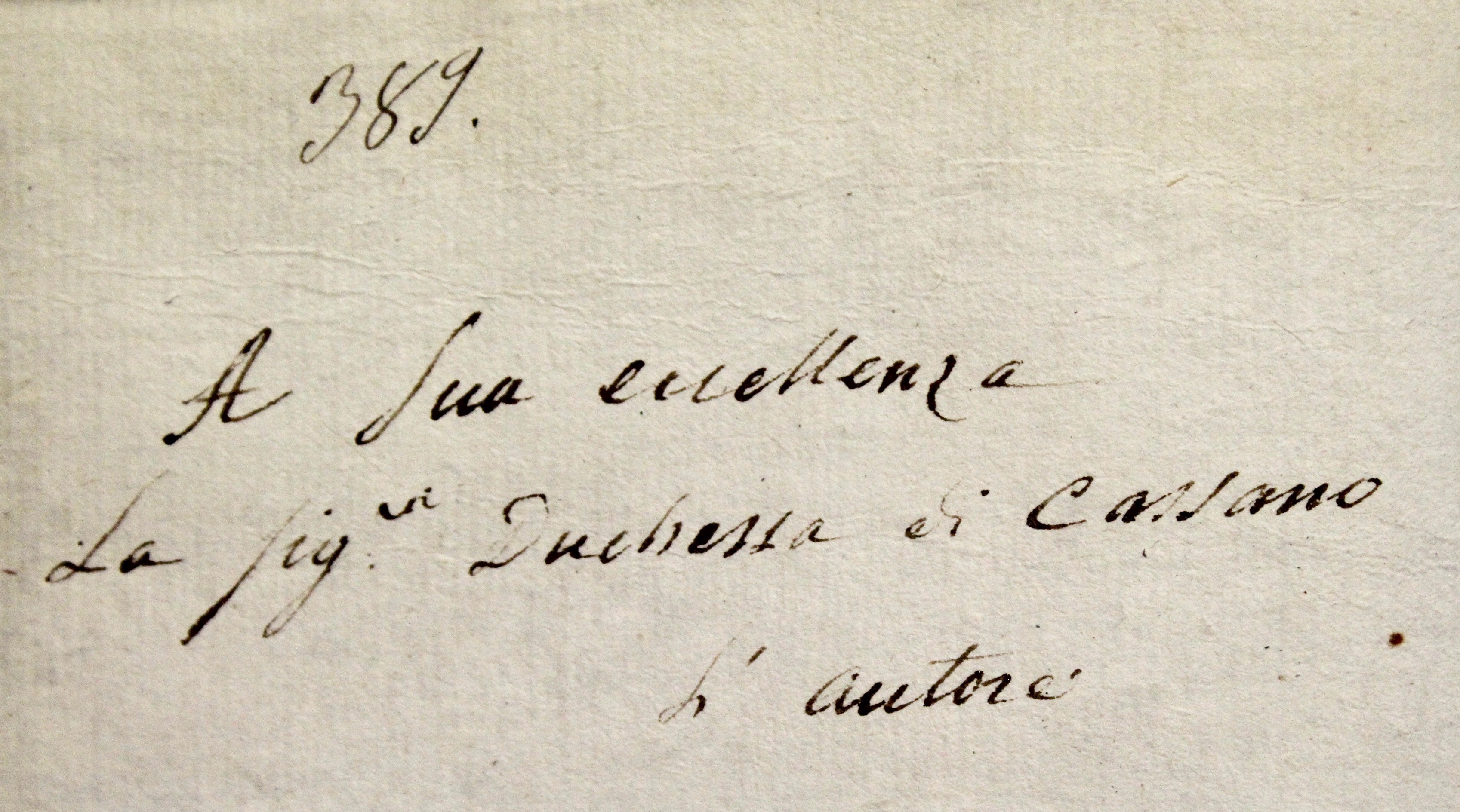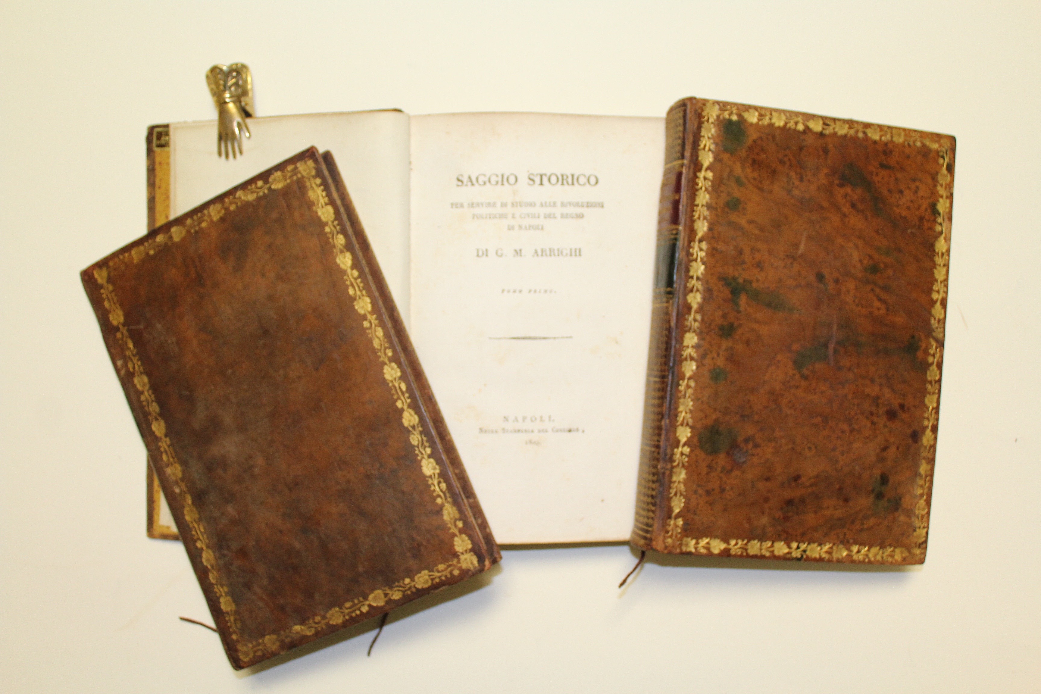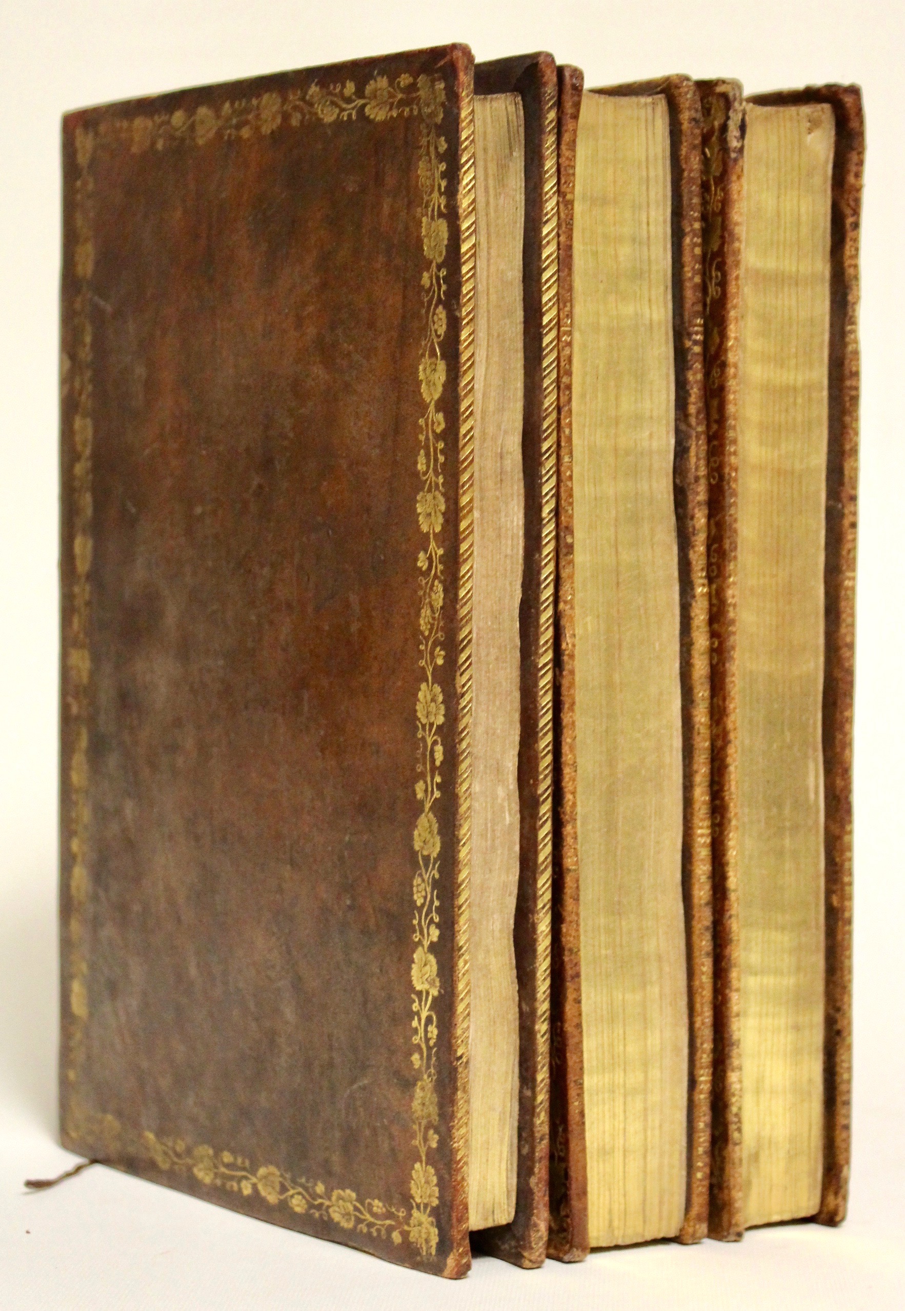 Tre volumi in 8° (mm 230x150); pp. IV, 211; 234, 1 n.n. con errata; 270. Elegante legatura in piena pelle con ampia bordura floreale dorata ai piatti, dorsi con doppio tassello, titolo e fregi geometrici, tutto inciso in oro, tagli dorati. Dedica dell’autore a Sua Eccellenza la duchessa di Cassano al verso del foglio di guardia iniziale