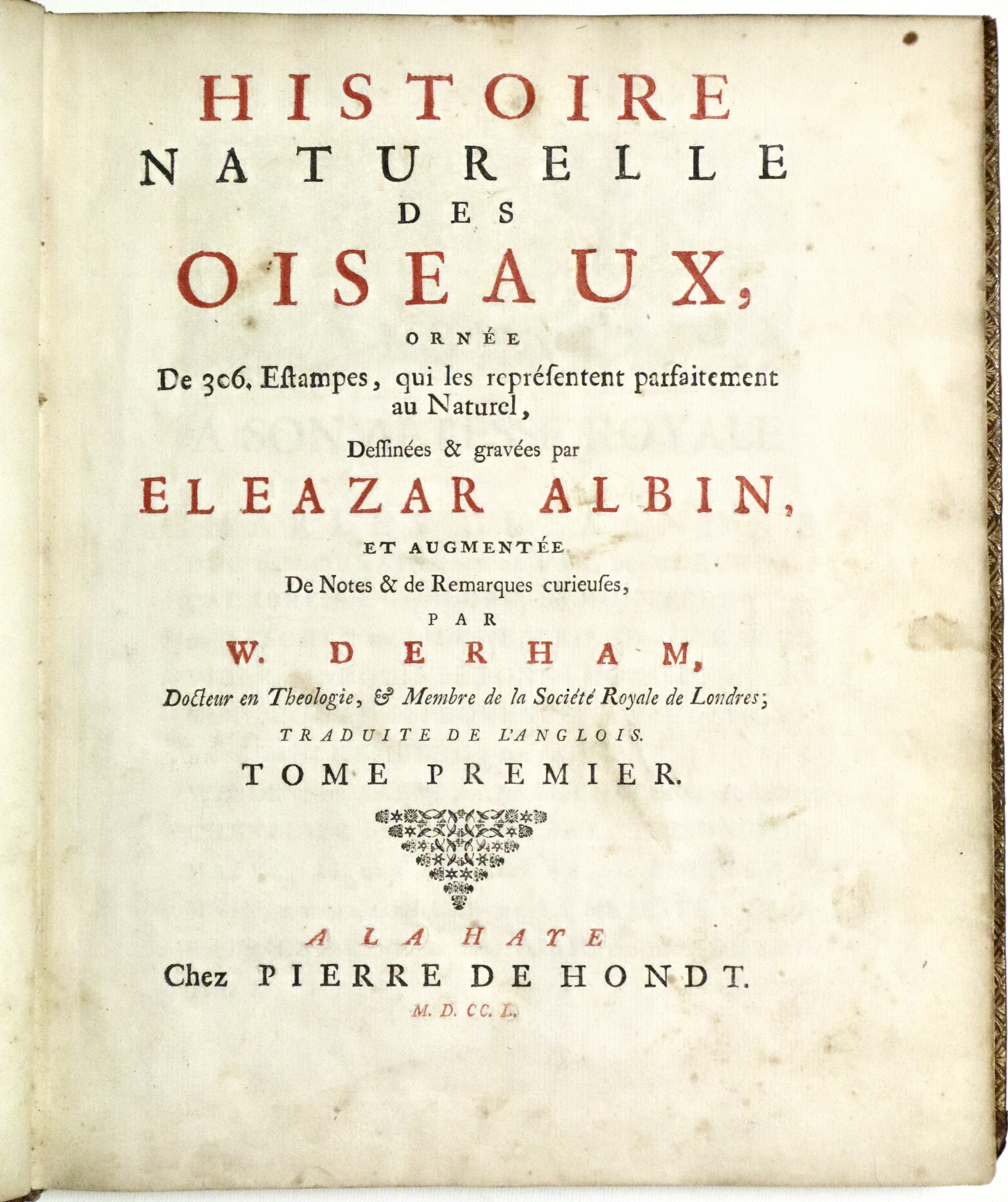 Histoire Naturelle des Oiseaux ornée de 306 estampes, qui les représentent parfaitement au Naturel, Dessinées et gravées par Eleazar Albin et augmentée de Notes & de Remarques curieuses par W. Derham.