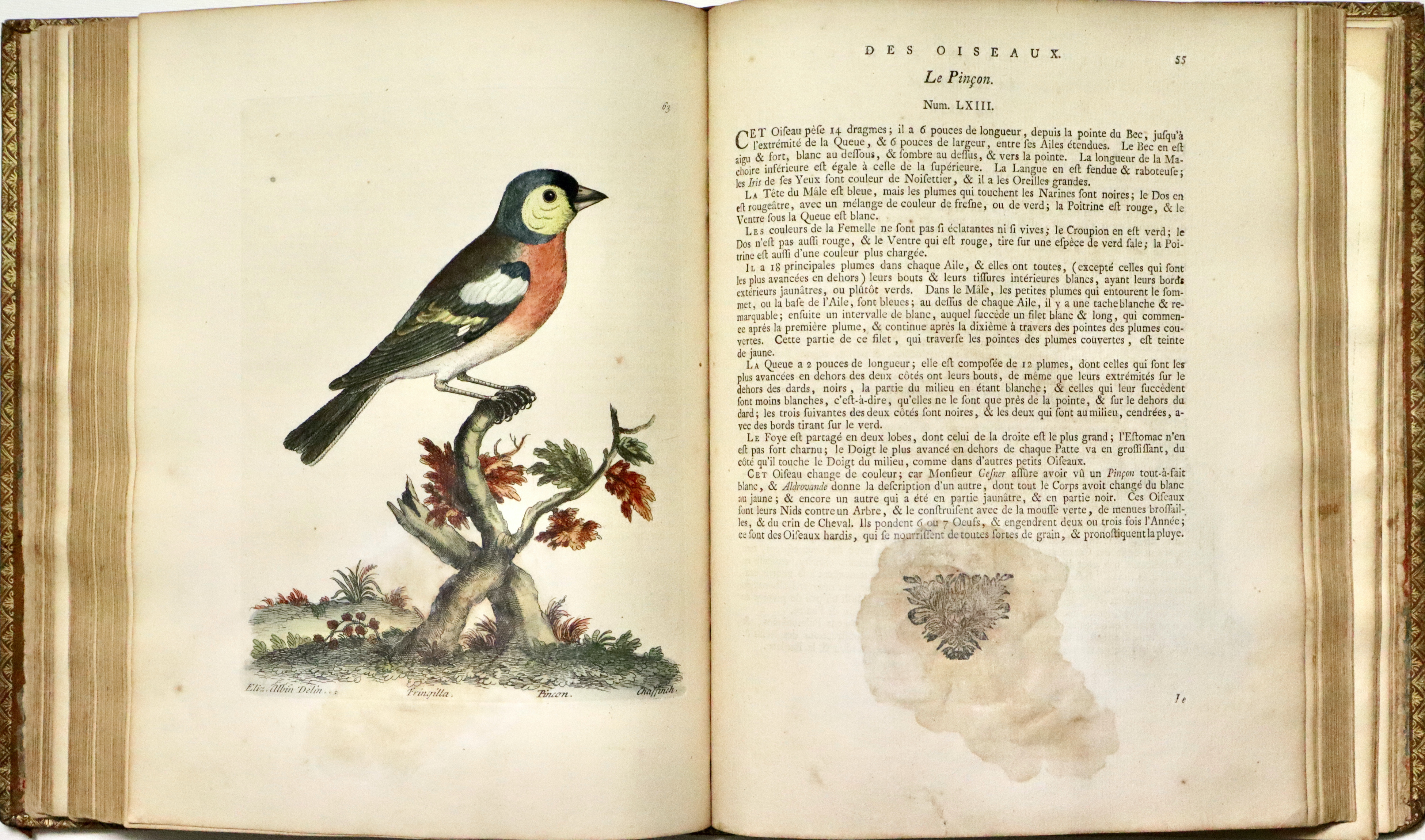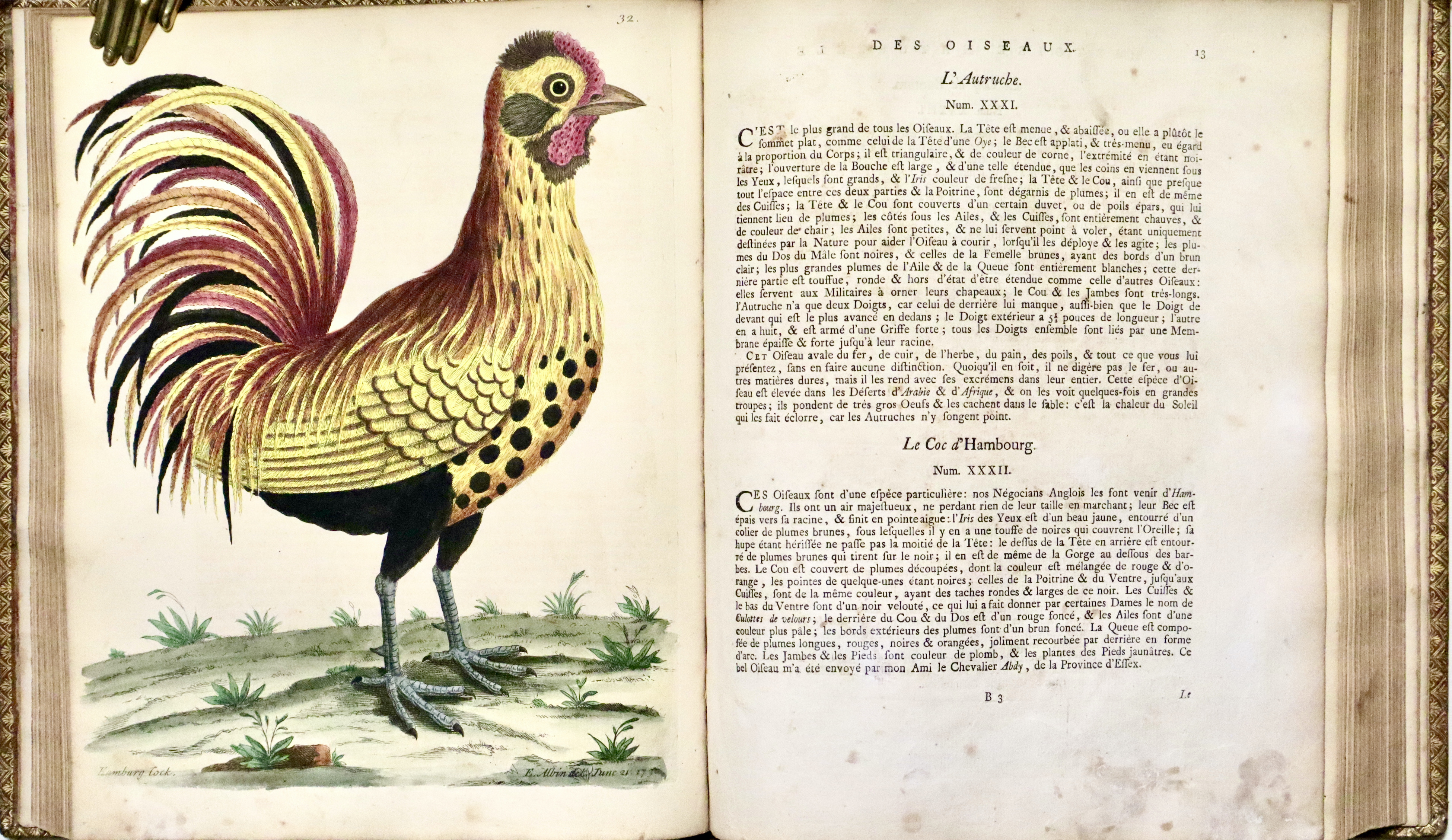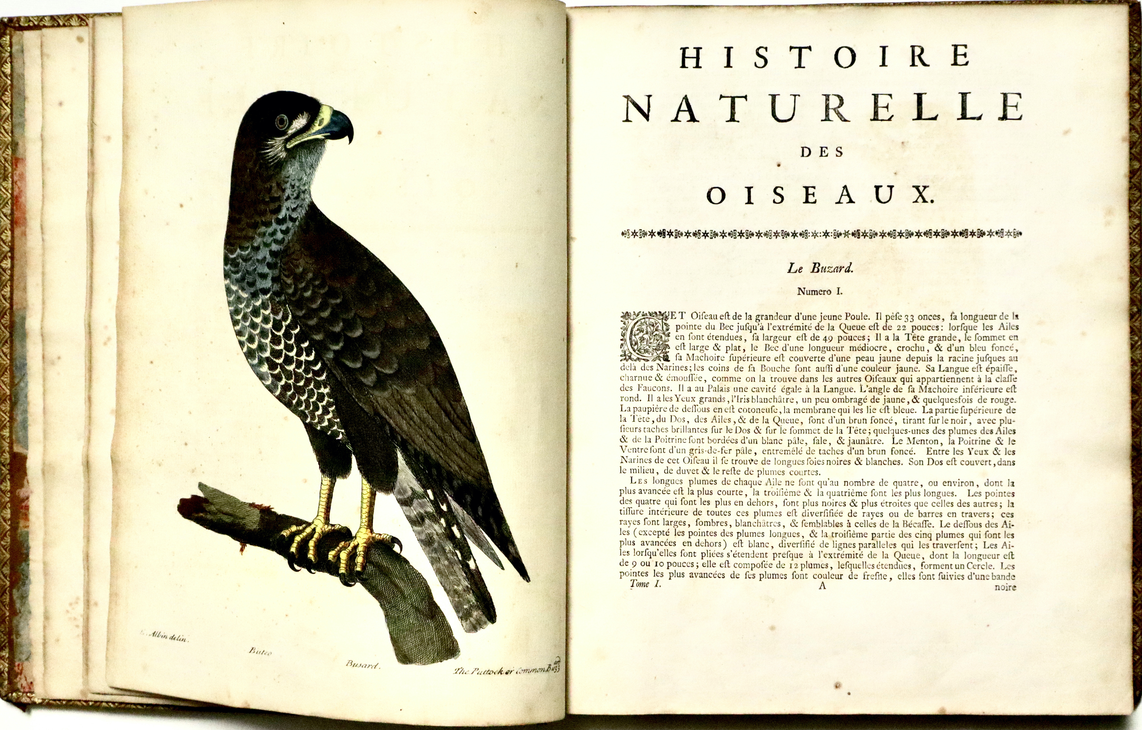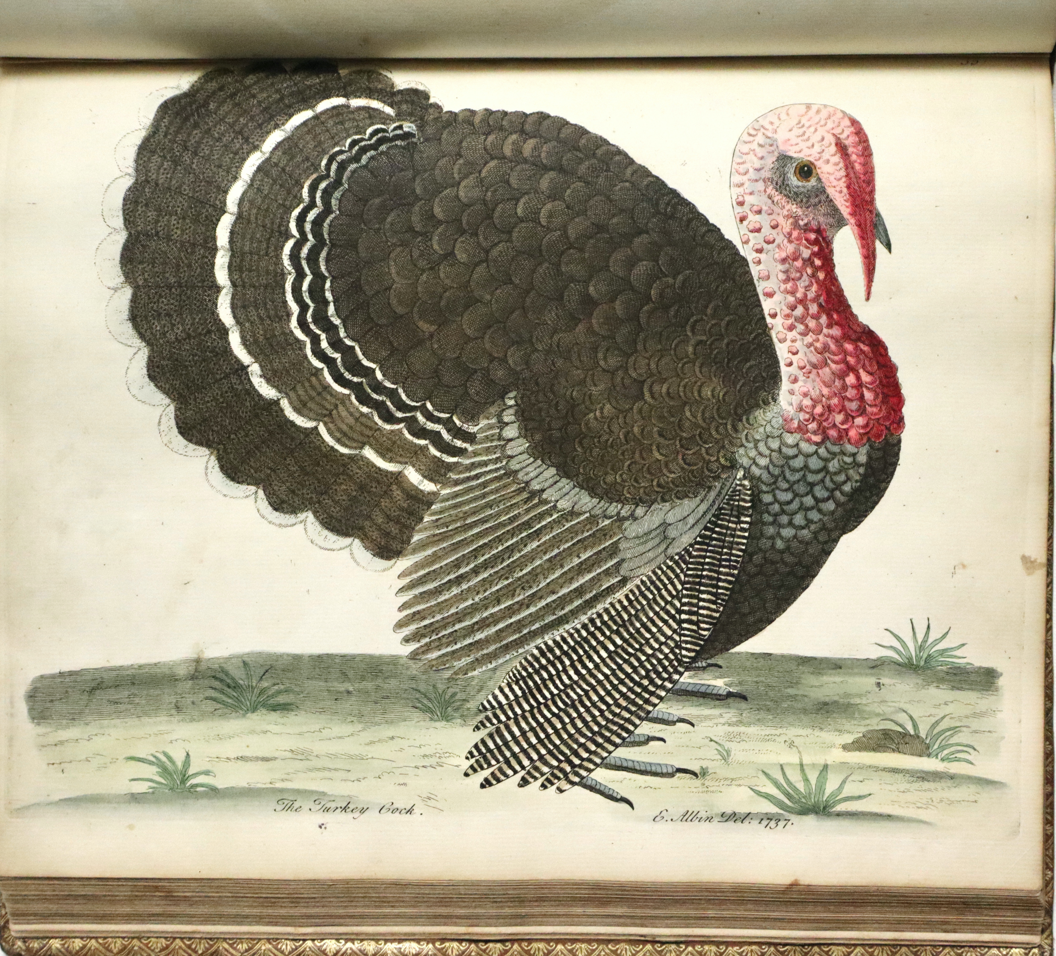 Prima edizione francese (L'edizione originale fu pubblicata a Londra tra il 1731 e il 1738). Opera molto ricercata per le 306 superbe tavole di uccelli che lo illustrano, incise finemente all’acquaforte dai disegni dell’autore e di sua figlia Elizabeth Albin e colorate a mano da loro stessi; come riportato nella prefazione al lettore dove Albin scrive.: “Per quanto riguarda i dipinti, sono tutti realizzati dal vero, con tutta l’accuratezza che ho potuto ottenere sia con la mia mano, sia con quella di mia figlia, alla quale ho insegnato a disegnare e dipingere dal vero“. Le tavole infatti rappresentano perfettamente al naturale i vari uccelli e sono arricchite da descrizioni in francese, inglese e latino con note e osservazioni curiose di W. Derham. Per quanto riguarda le descrizioni, esse si basano principalmente sulle opere di John Ray Synopsis Methodica Avium. Curò inoltre un'edizione riveduta delle Miscellanea Curiosa, nonché la corrispondenza e la biografia di John Ray, divenendo così uno dei primi chierici naturalisti, che vedevano lo studio della scienza naturale come un'estensione della propria opera religiosa.