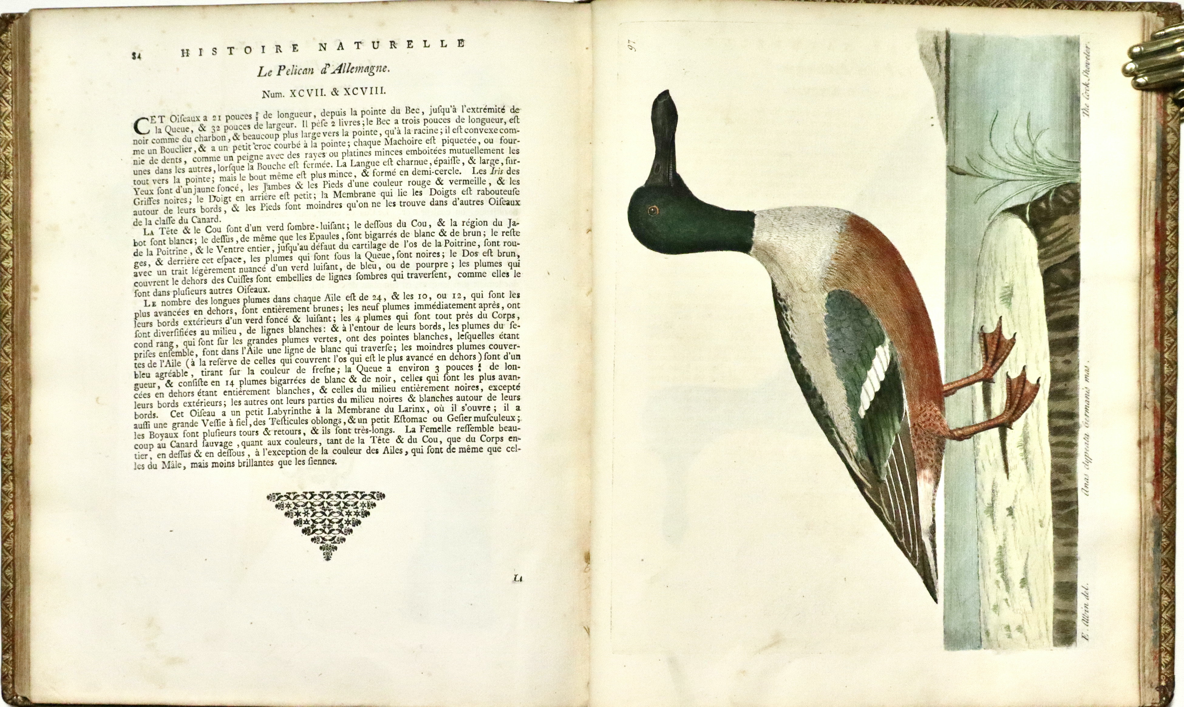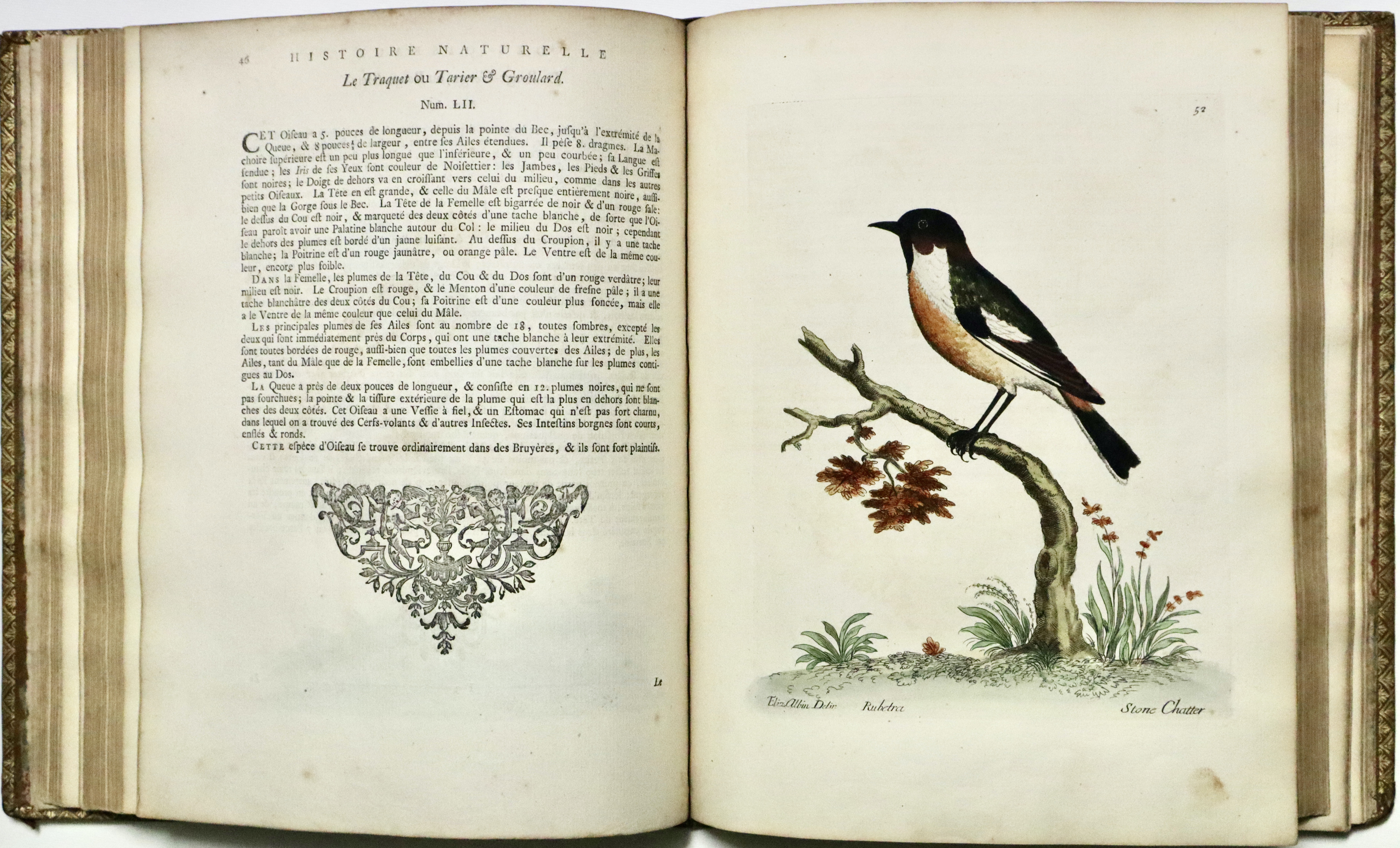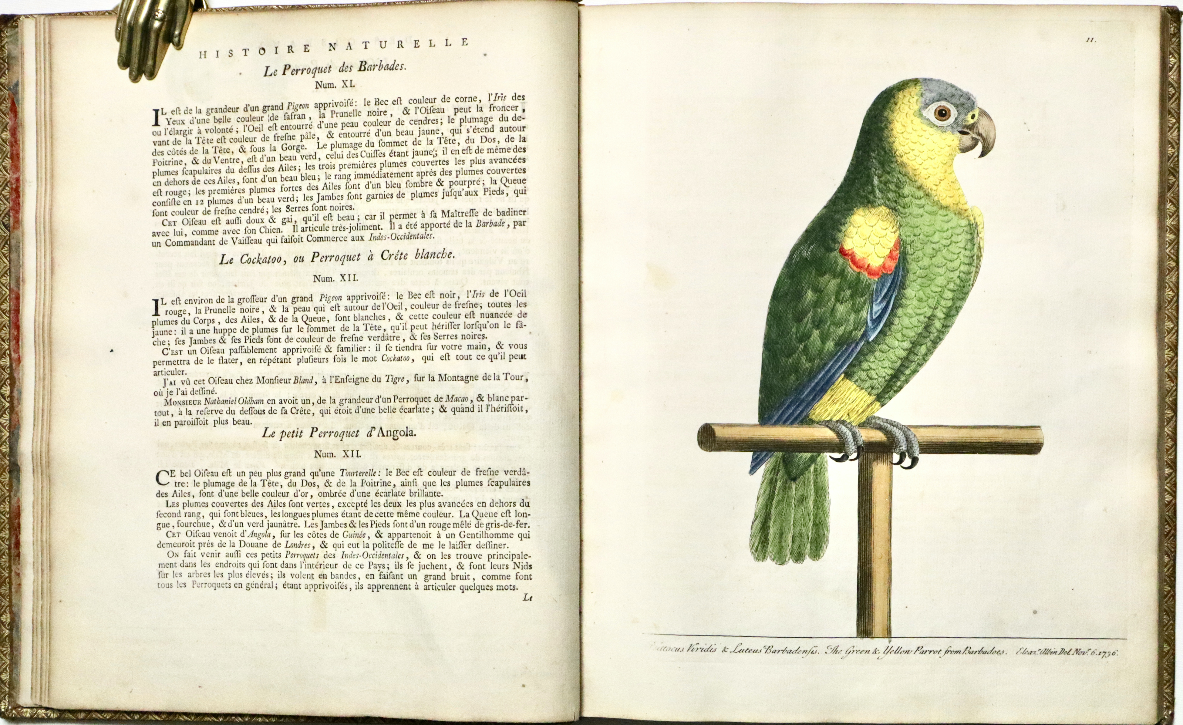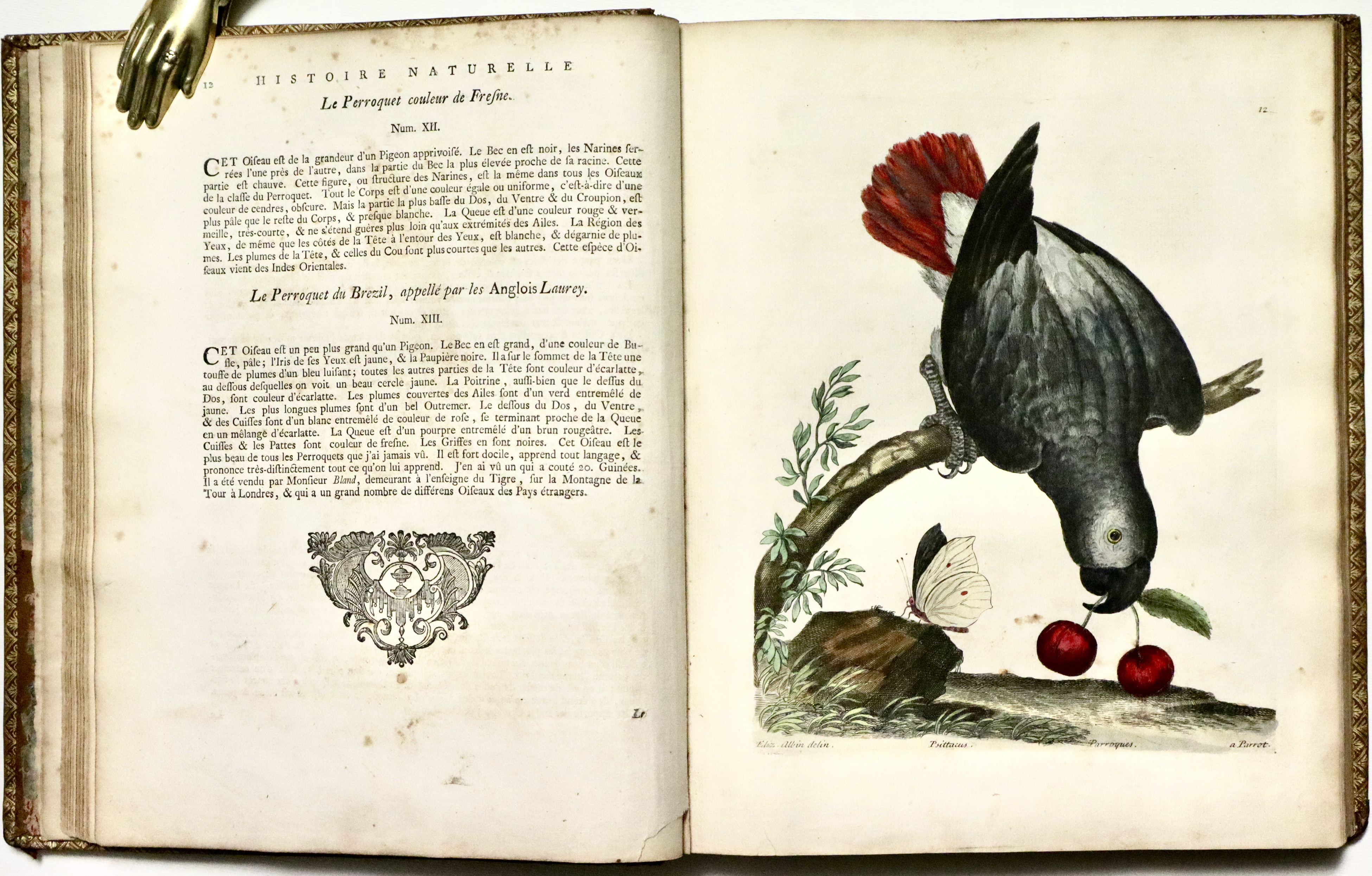 Prima edizione francese (L'edizione originale fu pubblicata a Londra tra il 1731 e il 1738). Opera molto ricercata per le 306 superbe tavole di uccelli che lo illustrano, incise finemente all’acquaforte dai disegni dell’autore e di sua figlia Elizabeth Albin e colorate a mano da loro stessi; come riportato nella prefazione al lettore dove Albin scrive.: “Per quanto riguarda i dipinti, sono tutti realizzati dal vero, con tutta l’accuratezza che ho potuto ottenere sia con la mia mano, sia con quella di mia figlia, alla quale ho insegnato a disegnare e dipingere dal vero“. Le tavole infatti rappresentano perfettamente al naturale i vari uccelli e sono arricchite da descrizioni in francese, inglese e latino con note e osservazioni curiose di W. Derham. Per quanto riguarda le descrizioni, esse si basano principalmente sulle opere di John Ray Synopsis Methodica Avium. Curò inoltre un'edizione riveduta delle Miscellanea Curiosa, nonché la corrispondenza e la biografia di John Ray, divenendo così uno dei primi chierici naturalisti, che vedevano lo studio della scienza naturale come un'estensione della propria opera religiosa.