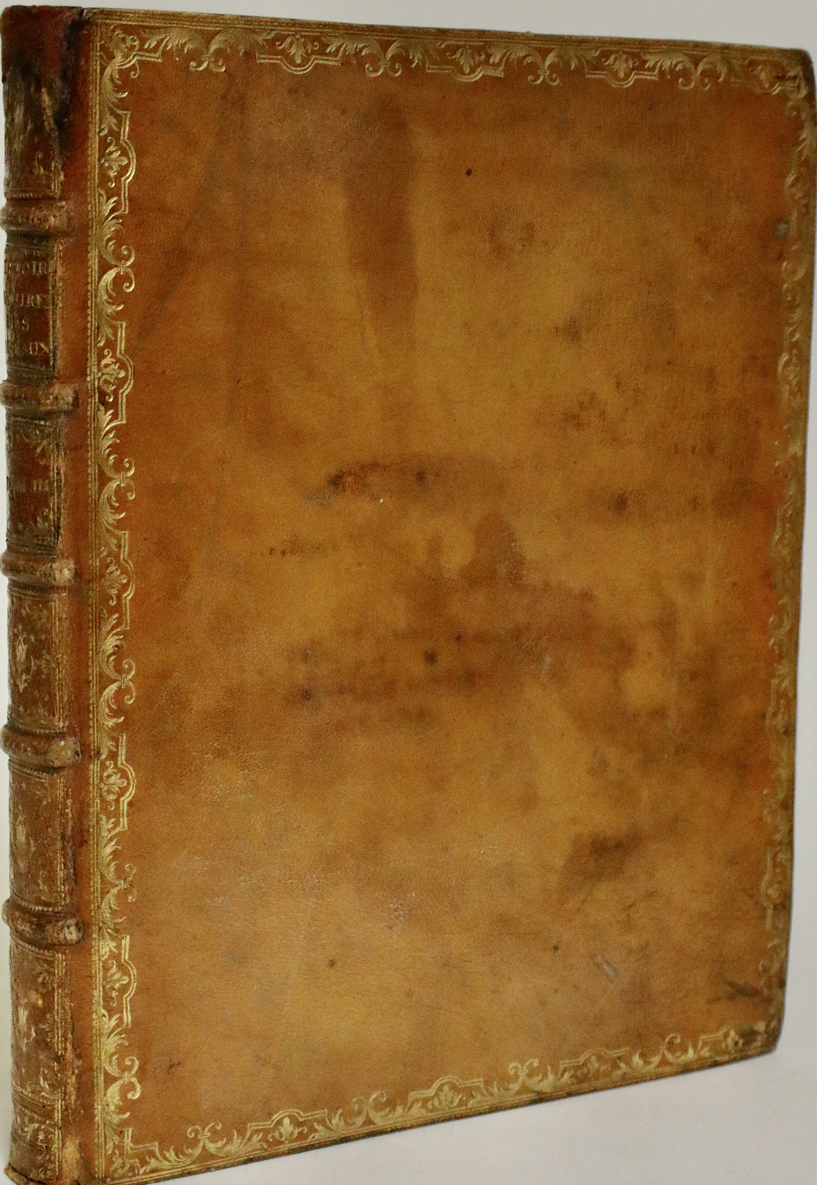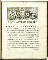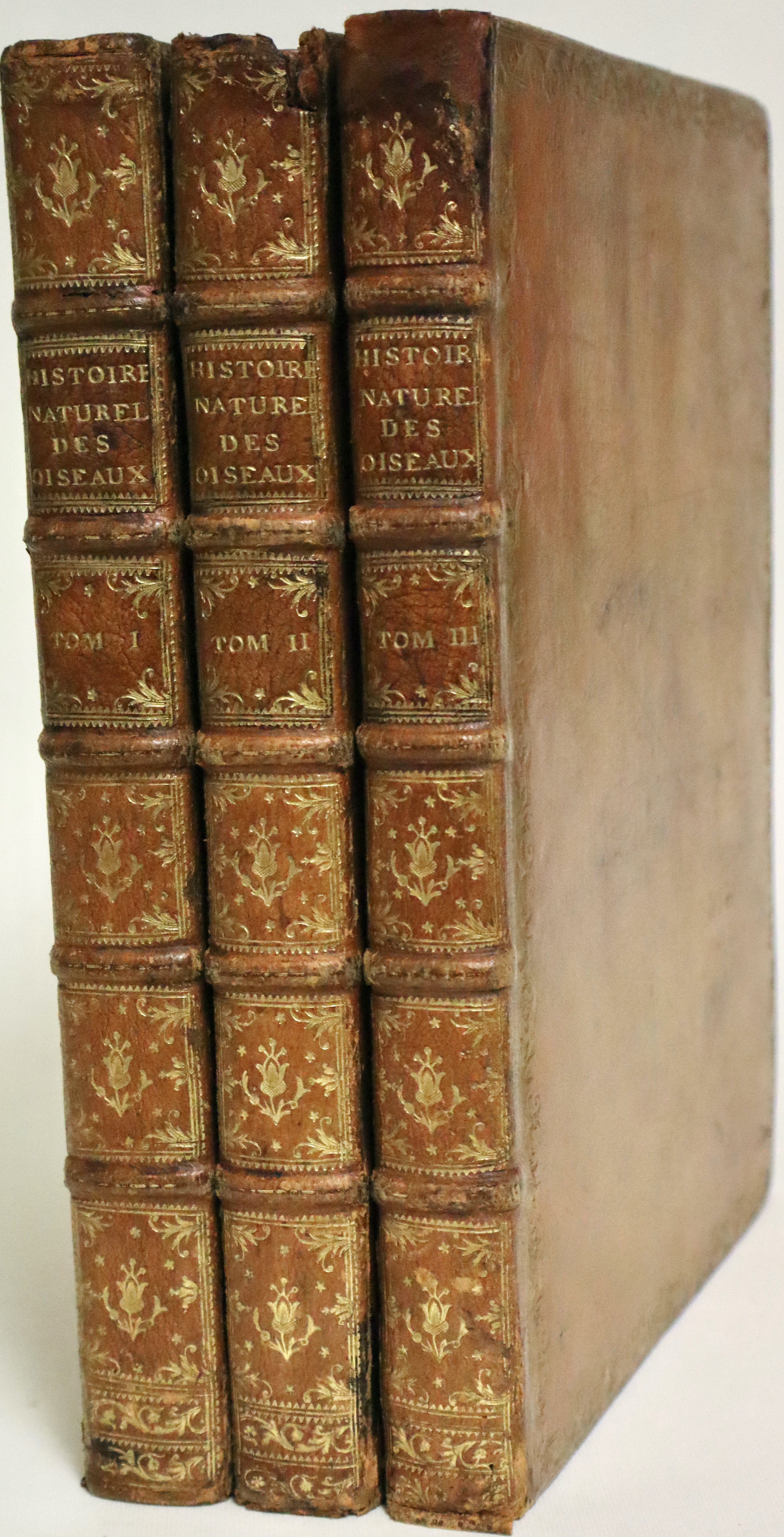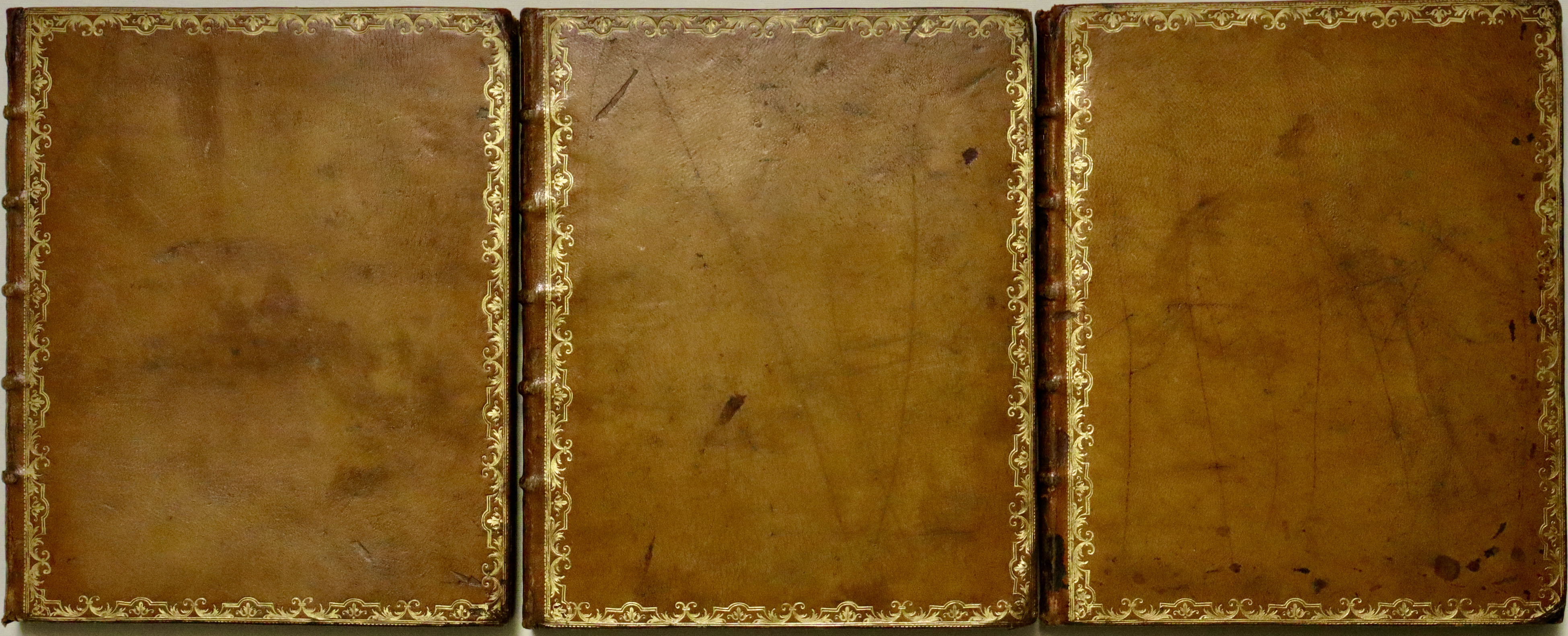 3 volumi in 4°(mm 290x240); Vol. I: pagg. (8 compreso frontespizio), 90 con 101 tavole incise in rame e dipinte a mano d’epoca. Vol. II pagg. (4 compreso il frontesp.), 70 con 104 tavole, (1 carta bianca); Vol. III pagg. (4 compr. il front), 44 con 101 tavole, (1 carta bianca). Piena pelle di vitello color nocciola, dorso con 5 nervature recanti titoli impressi in oro, scomparti con raffinati fregi dorati con fioroni tra le nervature, tagli, dentelle e ricca cornice ai piatti sempre in oro con motivi a ramages. Sguardie marmorizzate.