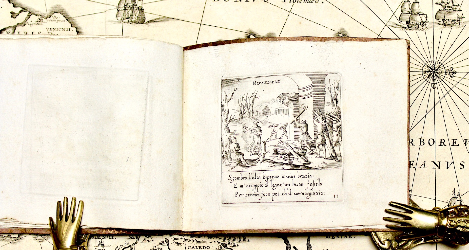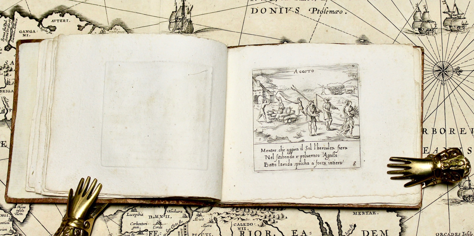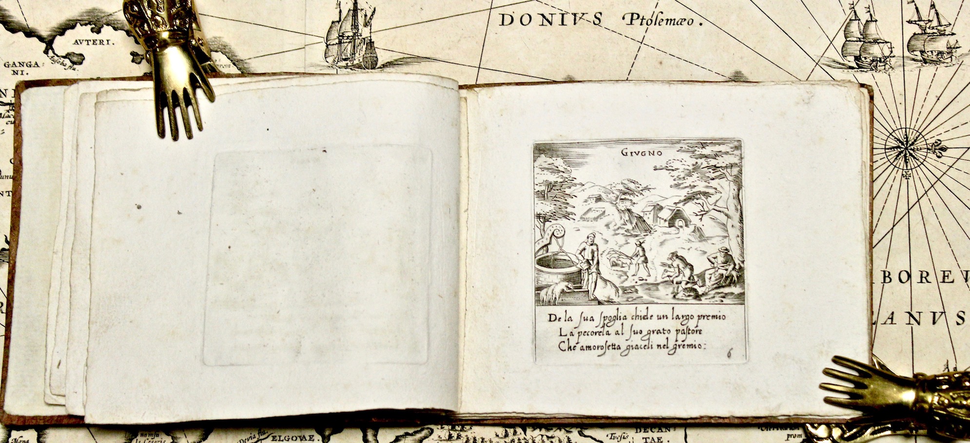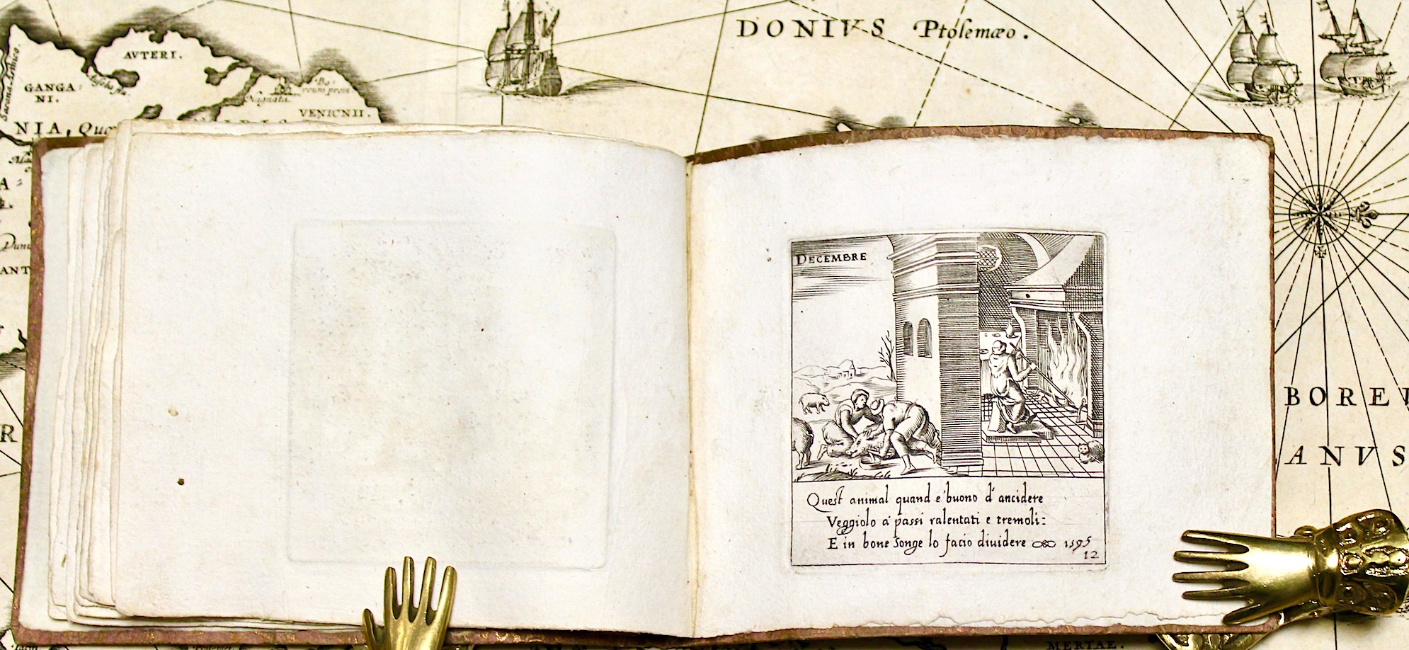 In 8vo oblungo (mm 105x14); legatura di recente esecuzione in cartonato ricoperto da bella carta damascata settecentesca; le incisioni (mm 68x7) sono numerate da 1 a 12, riportano il nome del mese in alto sulla figura e sono corredate da una terzina di commento. Il linguaggio denota una certa influenza dialettale veneta. La carta, molto spessa, pur non presentando alcuna filigrana, per la sua pulizia d’impasto è sicuramente riconducibile all’inizio del XVII secolo. Ottimo stato di conservazione e ottima impressione delle tavole. APPARENTEMENTE SCONOSCIUTA serie anonima di stampe popolari, che, come tutte le pubblicazioni di questo genere (calendari, lunari, effemeridi, ecc.), per il loro scopo pratico e per il loro scarso valore commerciale sono andate sistematicamente perdute nel corso dei secoli e sono pertanto di grandissima rarità. Le figure di questa suite si richiamano ai consueti canoni figurativi legati alla rappresentazione dei mesi, già da tempo codificati, ma devono il loro interesse soprattutto alla rarità di questo genere di pubblicazioni a stampa. Il volume curato da A. Rigoli e A. Amitrano Savarese, riguardante le stampe popolari profane della raccolta Achille Bertarelli, una delle maggiori in Italia (Fuoco, acqua, cielo, terra. Stampe popolari profane della Civica Raccolta Achille Bertarelli, Vigevano, 1995), pur comprendendo una sezione (p. 251 e sgg.) dedicata al tema del ciclo dei mesi, non riporta nulla di paragonabile alla presente serie. Apparentemente sconosciuto.