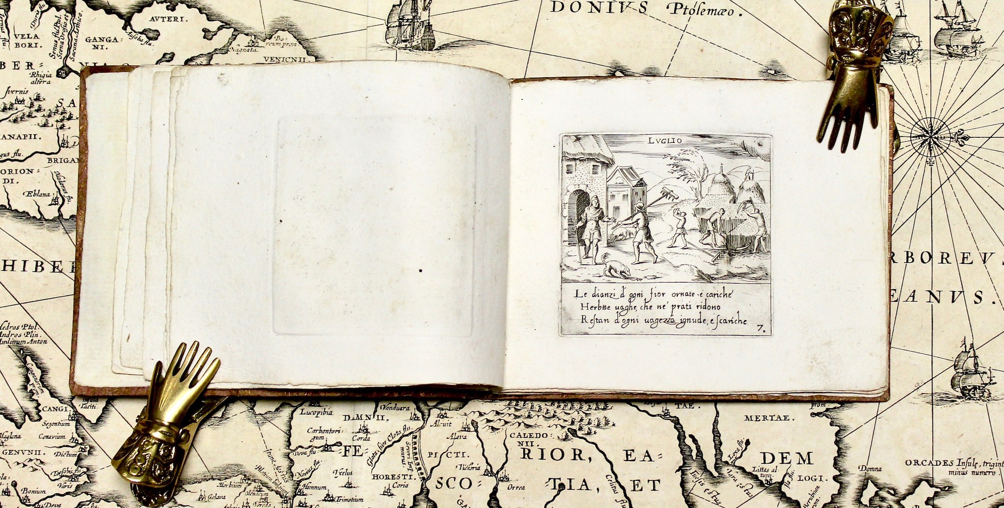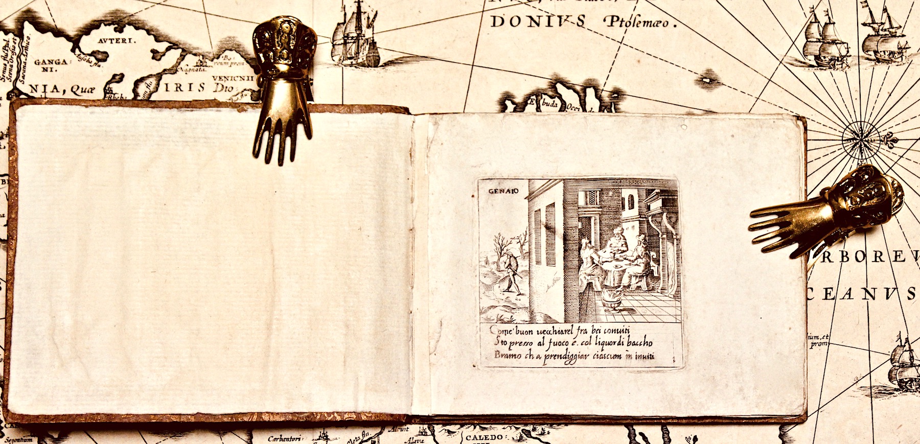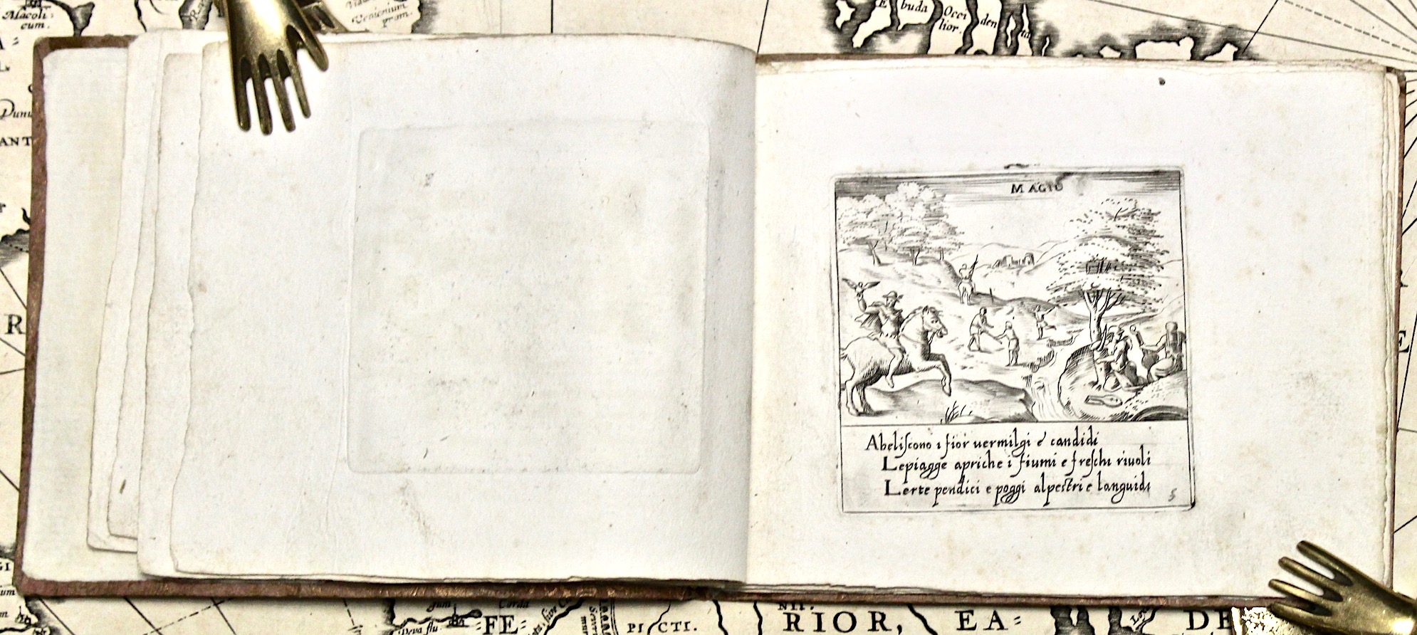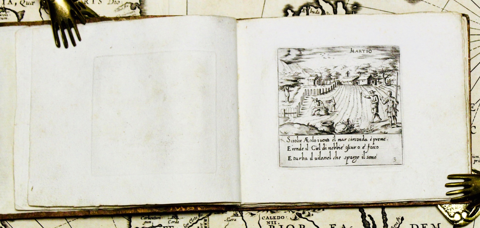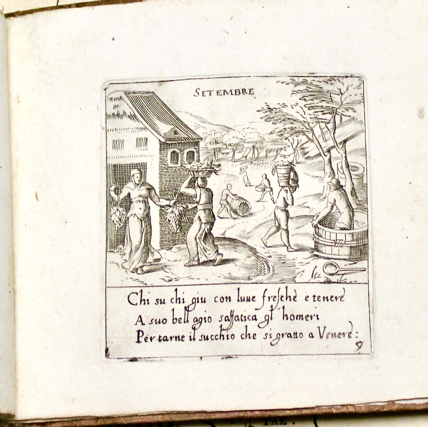 In 8vo oblungo (mm 105x14); legatura di recente esecuzione in cartonato ricoperto da bella carta damascata settecentesca; le incisioni (mm 68x7) sono numerate da 1 a 12, riportano il nome del mese in alto sulla figura e sono corredate da una terzina di commento. Il linguaggio denota una certa influenza dialettale veneta. La carta, molto spessa, pur non presentando alcuna filigrana, per la sua pulizia d’impasto è sicuramente riconducibile all’inizio del XVII secolo. Ottimo stato di conservazione e ottima impressione delle tavole. APPARENTEMENTE SCONOSCIUTA serie anonima di stampe popolari, che, come tutte le pubblicazioni di questo genere (calendari, lunari, effemeridi, ecc.), per il loro scopo pratico e per il loro scarso valore commerciale sono andate sistematicamente perdute nel corso dei secoli e sono pertanto di grandissima rarità. Le figure di questa suite si richiamano ai consueti canoni figurativi legati alla rappresentazione dei mesi, già da tempo codificati, ma devono il loro interesse soprattutto alla rarità di questo genere di pubblicazioni a stampa. Il volume curato da A. Rigoli e A. Amitrano Savarese, riguardante le stampe popolari profane della raccolta Achille Bertarelli, una delle maggiori in Italia (Fuoco, acqua, cielo, terra. Stampe popolari profane della Civica Raccolta Achille Bertarelli, Vigevano, 1995), pur comprendendo una sezione (p. 251 e sgg.) dedicata al tema del ciclo dei mesi, non riporta nulla di paragonabile alla presente serie. Apparentemente sconosciuto.