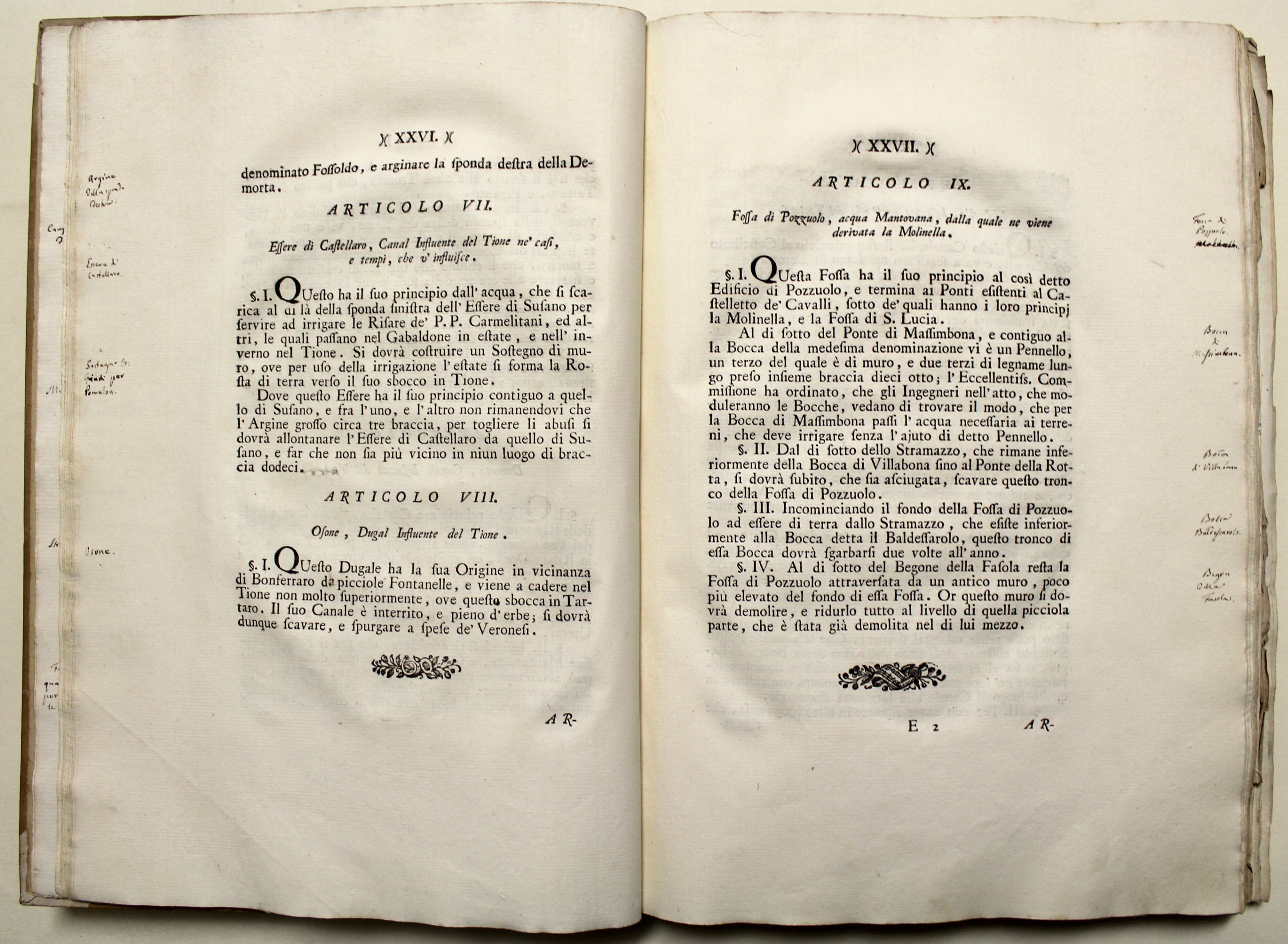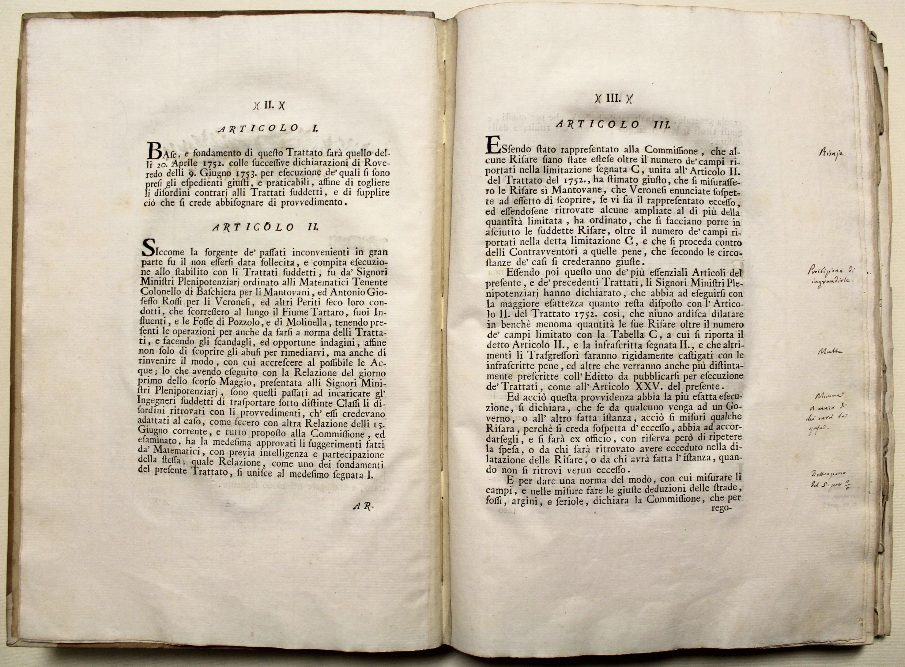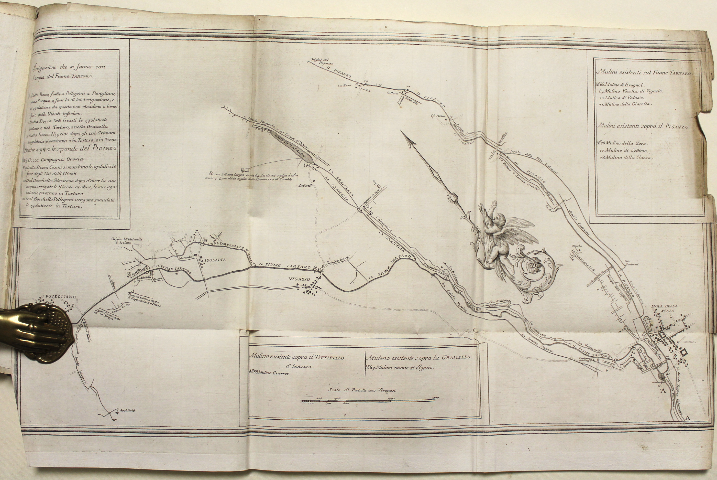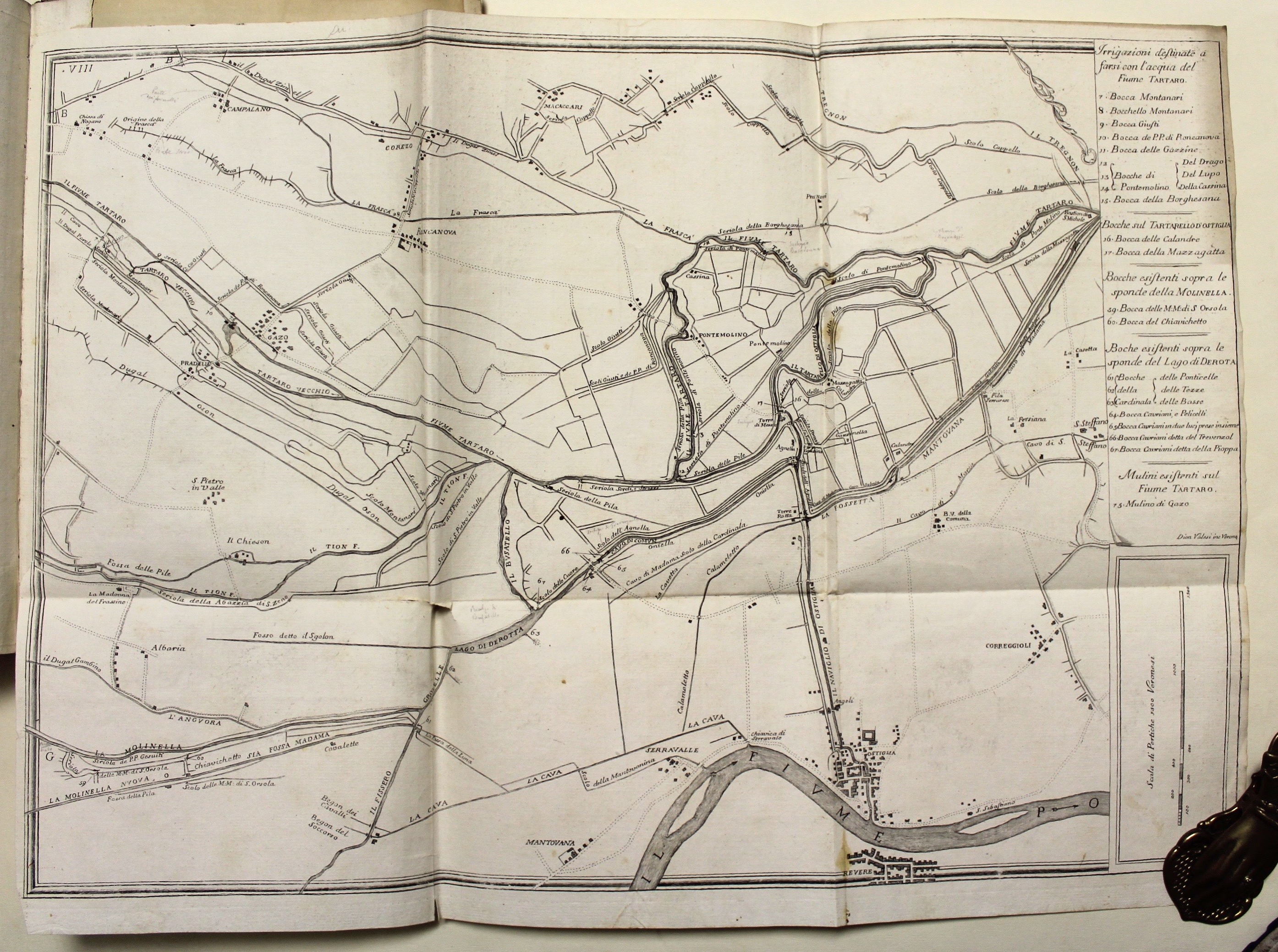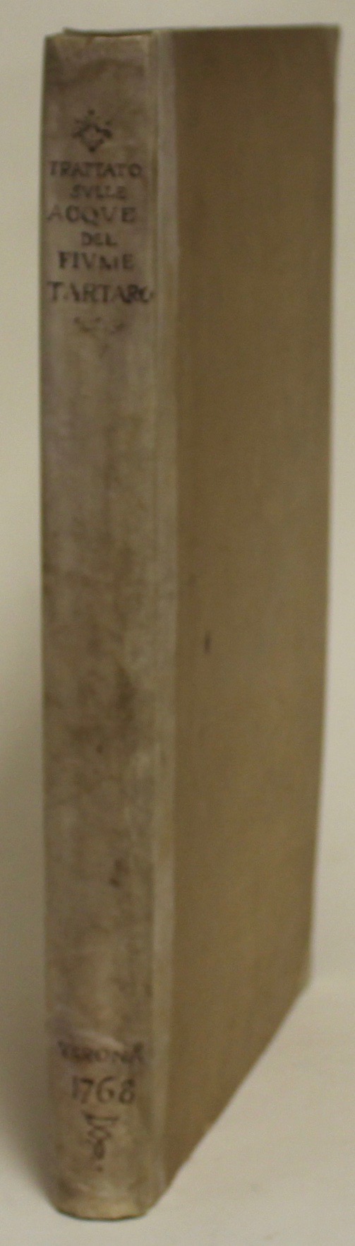 In Folio (mm 390x270); frontespizio figurato allegorico inciso in rame da Dionisio Valesi, pagg. 156, (2) + 4 tabelle tecniche rip. f.t. e 8 grandi carte topogr. di carattere idrografico-idraulico incise in rame. L’antiporta incisa raffigura le allegorie dei fiumi Tartaro, Tione, Mincio, e la Giustizia. Iniziali ornate, fregi e finalini silografici. Legatura coeva in mezza pergamena con angoli, titolo manoscritto al dorso, tagli marmorizzati, note marginali, un indice manoscritto non editoriale aggiunto alla fine sciolto. Prima edizione dell’importante ed assai conosciuto trattato firmato a Mantova nel giugno del 1765 fra i rappresentanti dell’imperatrice d’Austria Maria Teresa e del doge di Venezia. A questa ediz. orig. seguì una seconda pubblicata a Milano nel 1776 che è sostanzialmente una riedizione di questa, sebbene presenti piccole aggiunte. Le tavole tecniche e le belle carte idrografiche sono relative alle opere di irrigazione effettuate con le acque del Tartaro e dei suoi affluenti, secondo le determinazioni dei trattati di Ostiglia del 1752 e 1764, nonchè del trattato di Mantova del 1765. Descrive minuziosamente tutti i corsi d’acqua, i mulini esistenti sulle rive, fontane, seriole, fossi ecc. Le carte topogr. raffigurano i territori della bassa veronese e dell’alto mantovano, soprattutto le zone di Vigasio e Isola della Scala con i suoi affluenti (tav. I), Nogara e Pellegrina (tav. II), Nogarole (III), Sorgà, Erbè, Castellaro (IV), Bonferraro, Villimpenta (VII), Gazzo, Roncanova, Ostiglia (VIII).