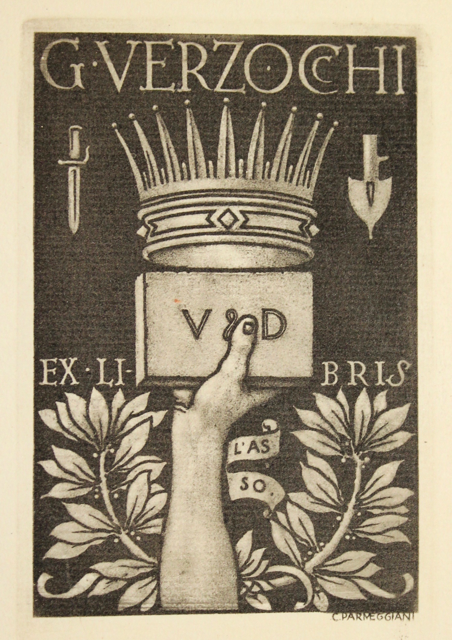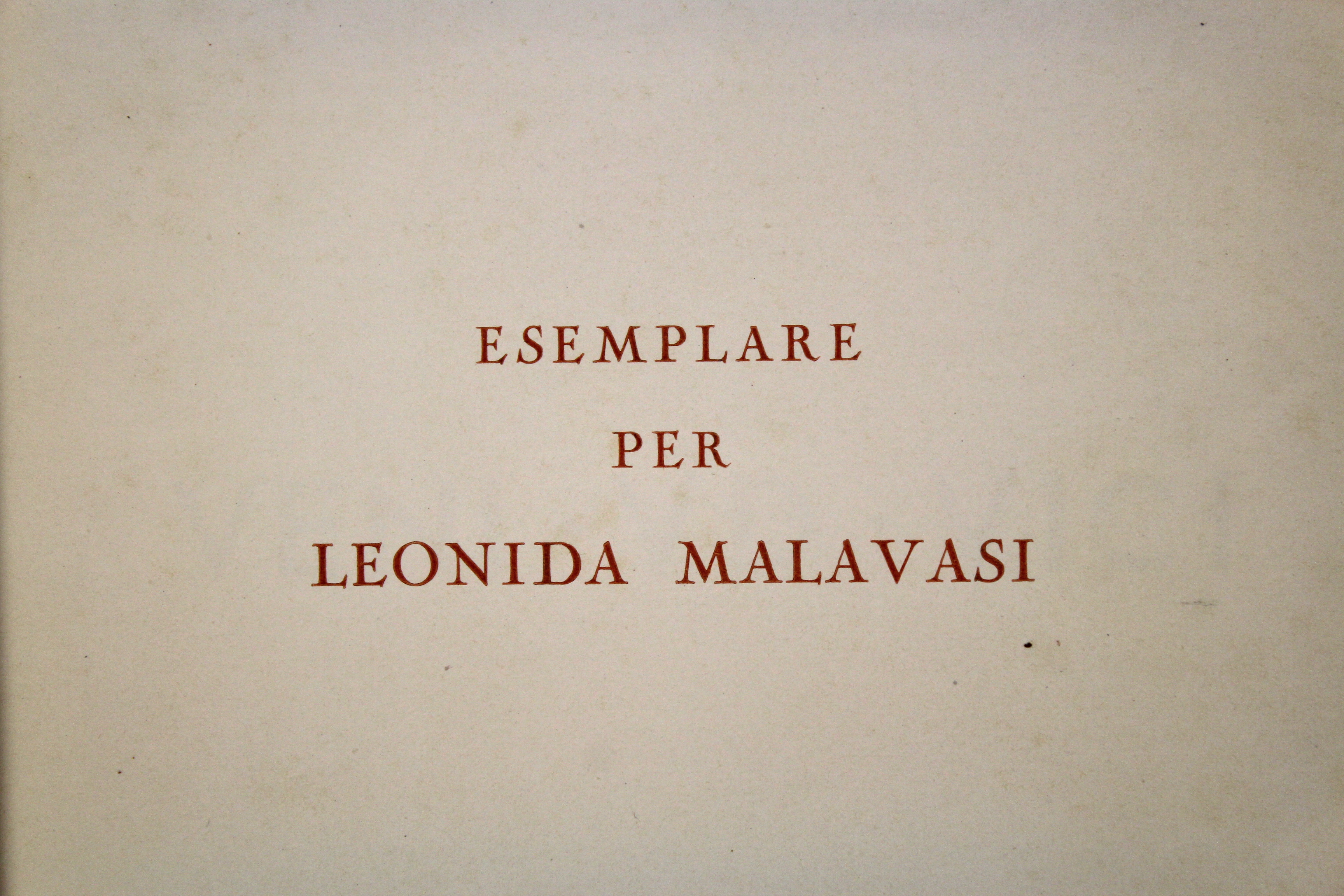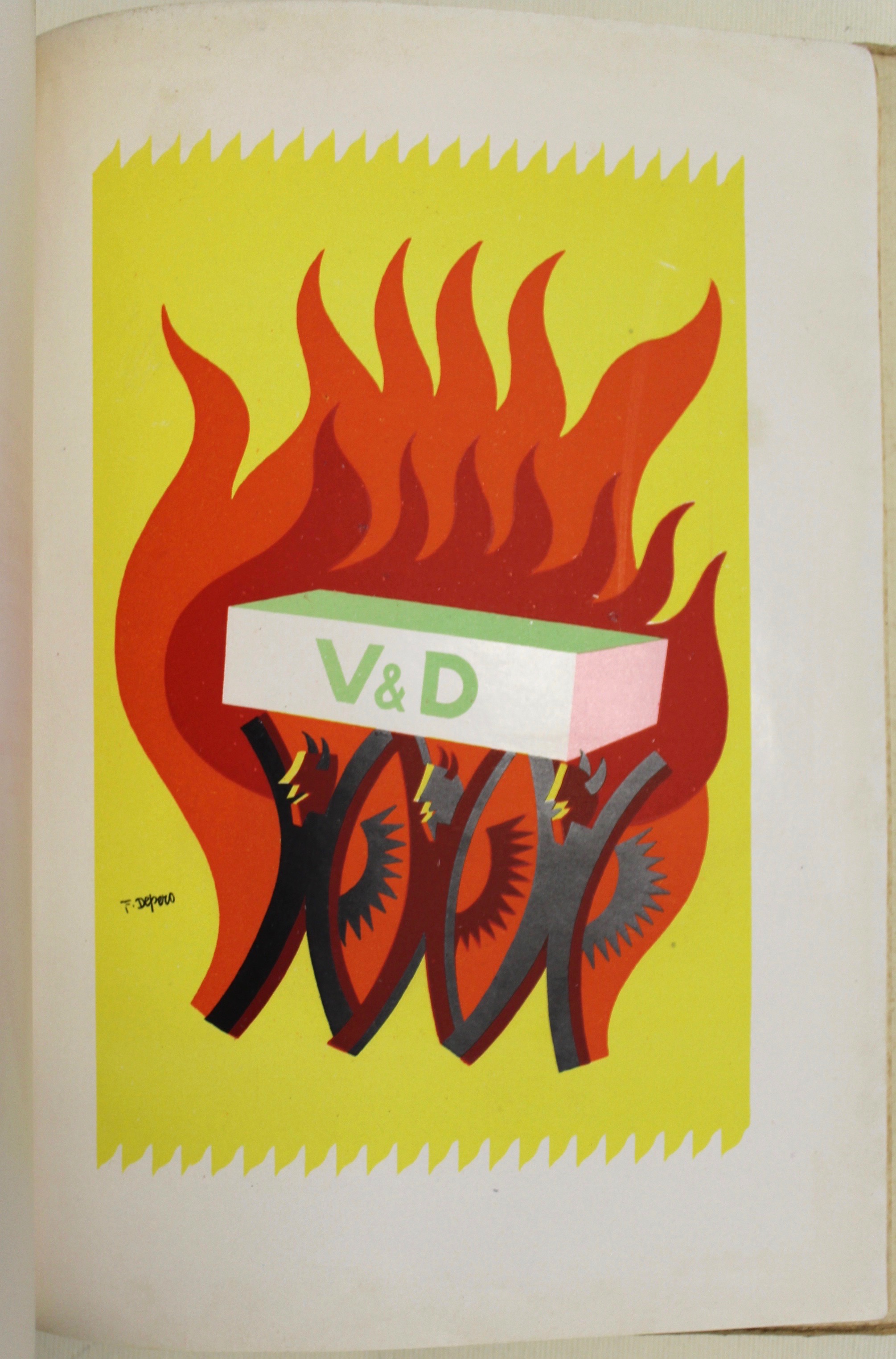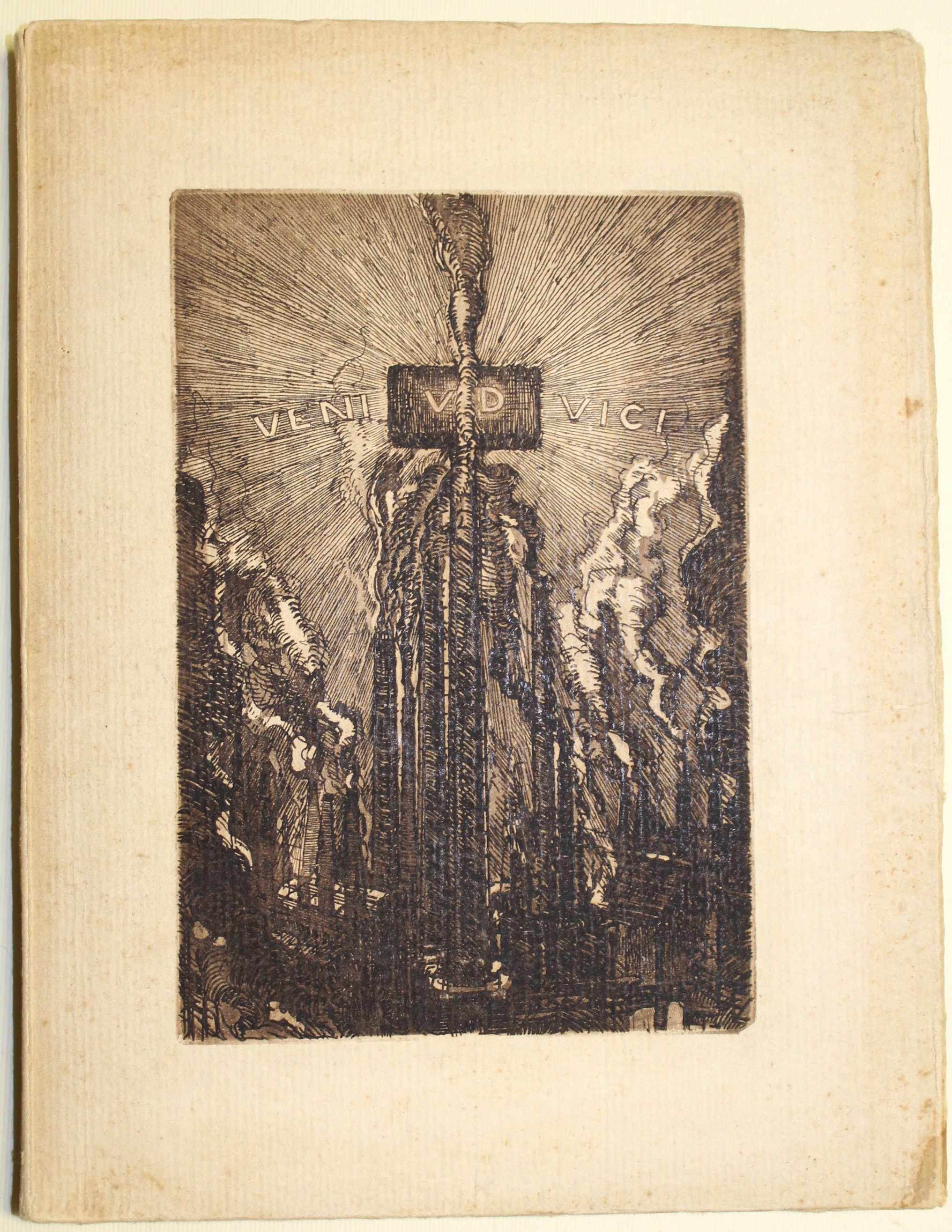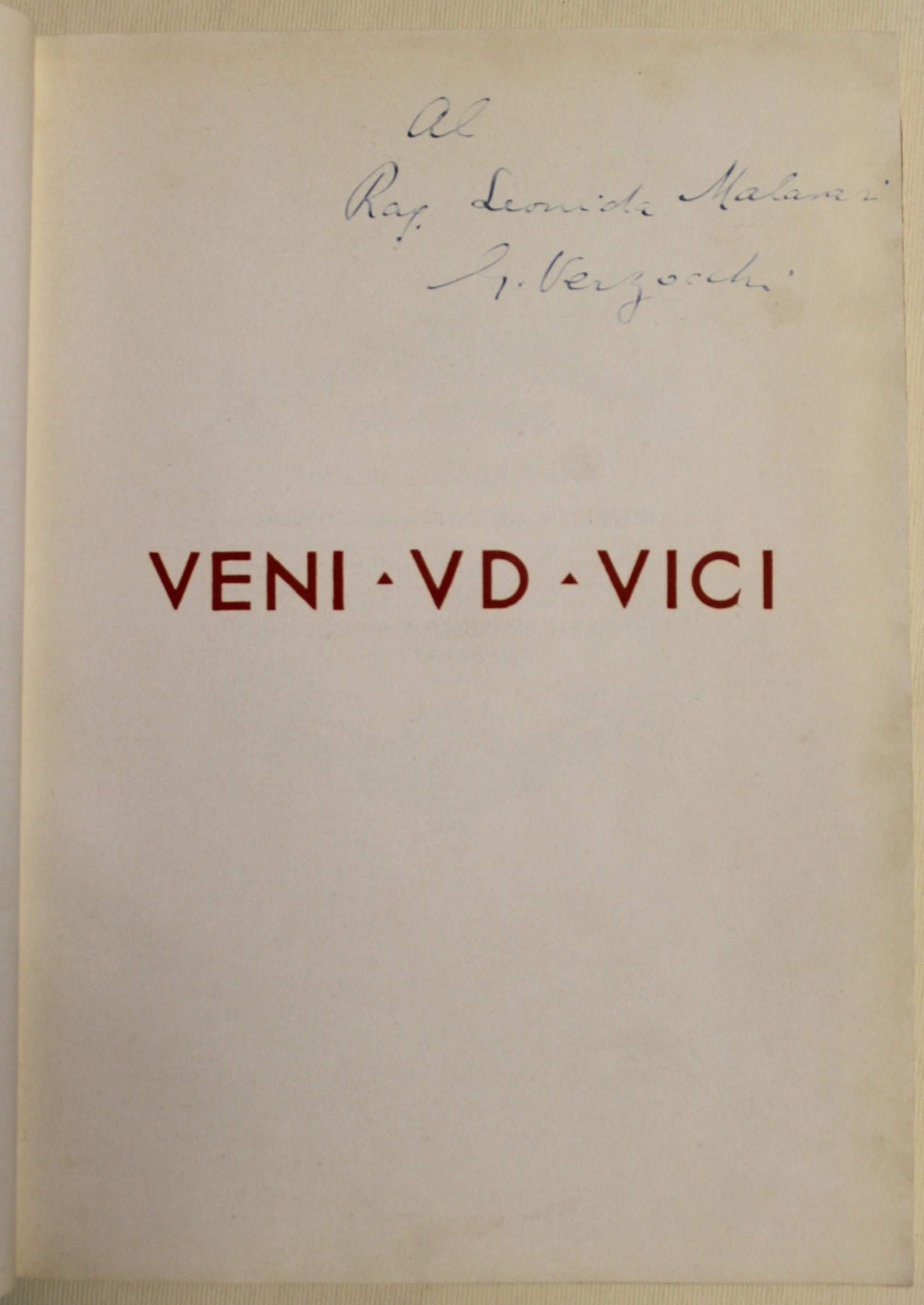 In 8° (mm 250x187); pp. (10) con ex libris inciso da C. Parmeggiani, foglio di dedica, frontespizio, elenco dei collaboratori e prefazione al lettore; seguono 35 tavv. Eseguite con tecniche diverse di Baldassini, Cisari, De Carolis, Depero, Dudovich, Marussig e tanti altri. Ciascuna tavola con veline parlanti che recano i commenti dei clienti della Verzoccchi. Cartoncino editoriale con piatti incisi in xilografia dal medesimo. Esemplare di dedica per Leonida Malavasi, con dedica autografa sopra al titolo. Unica edizione di questo raro catalogo pubblicitario fatto stampare dalla ditta Verzocchi produttrice di mattoni refrattari. Il titolo del catalogo gioca sul motto latino "Veni Vidi Vici" e le iniziali della ditta "V&D”. Significativo per la storia della pubblicità del periodo. Buon esemplare con lievi tracce di sporco e fioriture alla legatura.