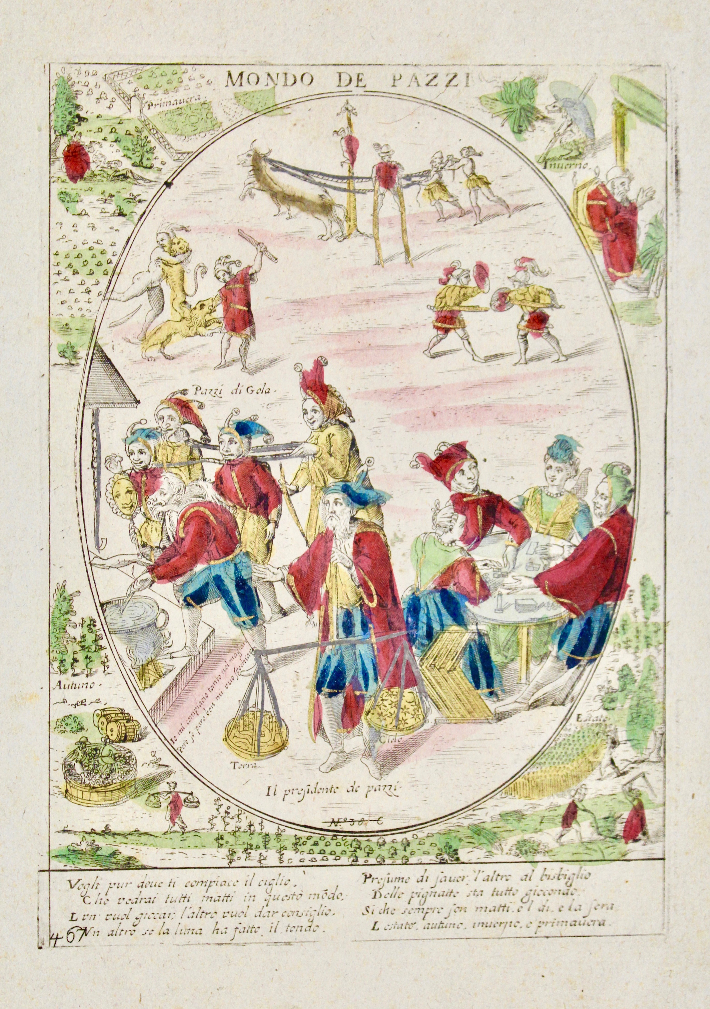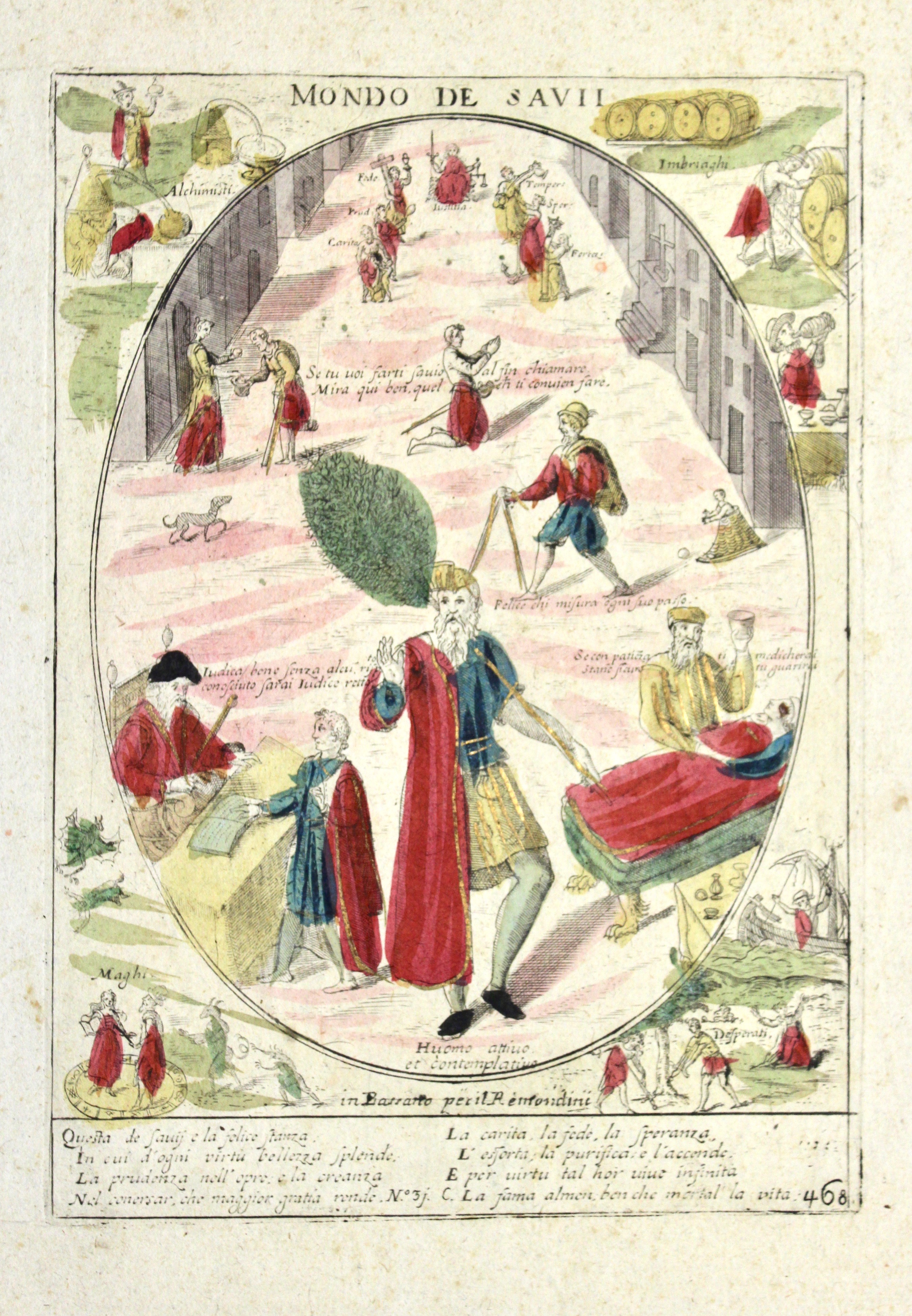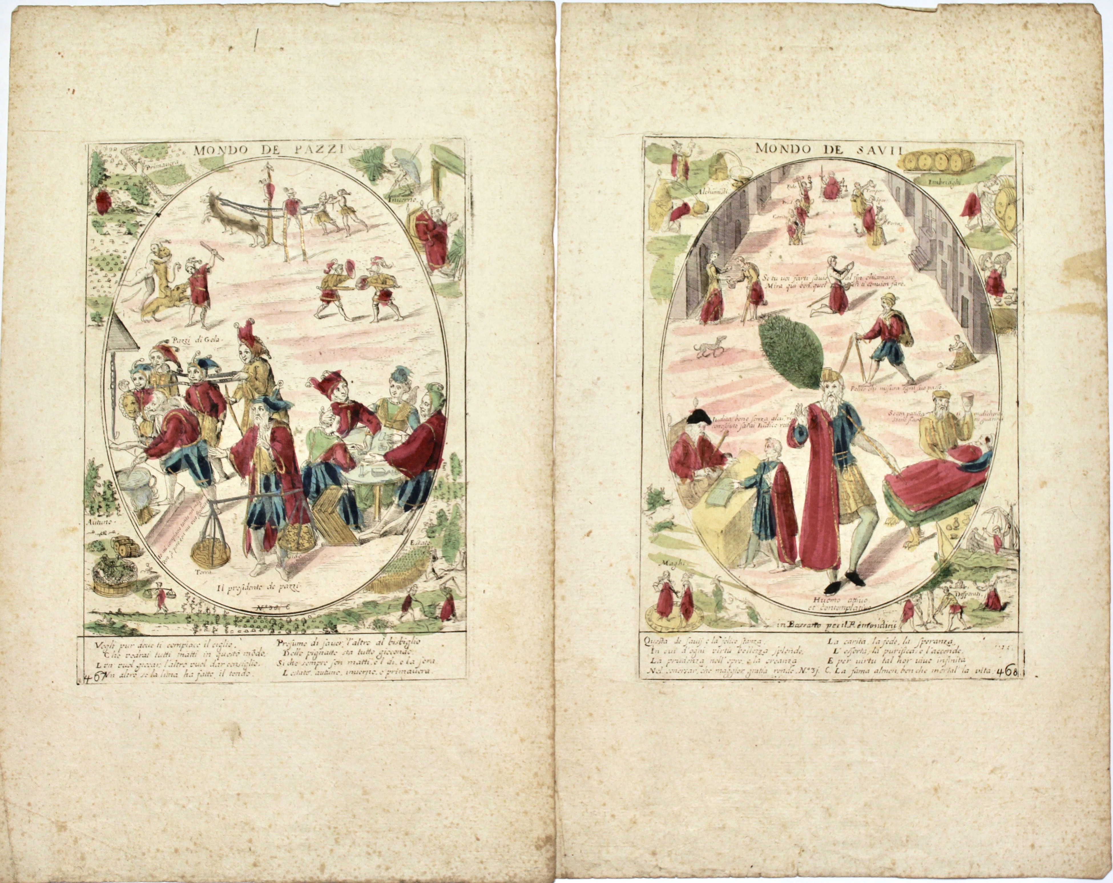 Coppia di rarissime stampe popolari pubblicate dai Remondini. Incisioni in rame, mm 240x165 con ampi margini, colorate a mano d’epoca. Al centro degli ovali vengono indicati esempi delle due categorie di uomini: i giocatori e i pazzi di gola fra i pazzi ed il giudice, il medico fra i savi. In basso un testo in rima descrive brevemente i due generi di persone. Esemplari molto ben conservati con leggere macchie marginali.
