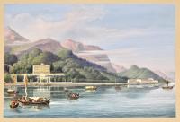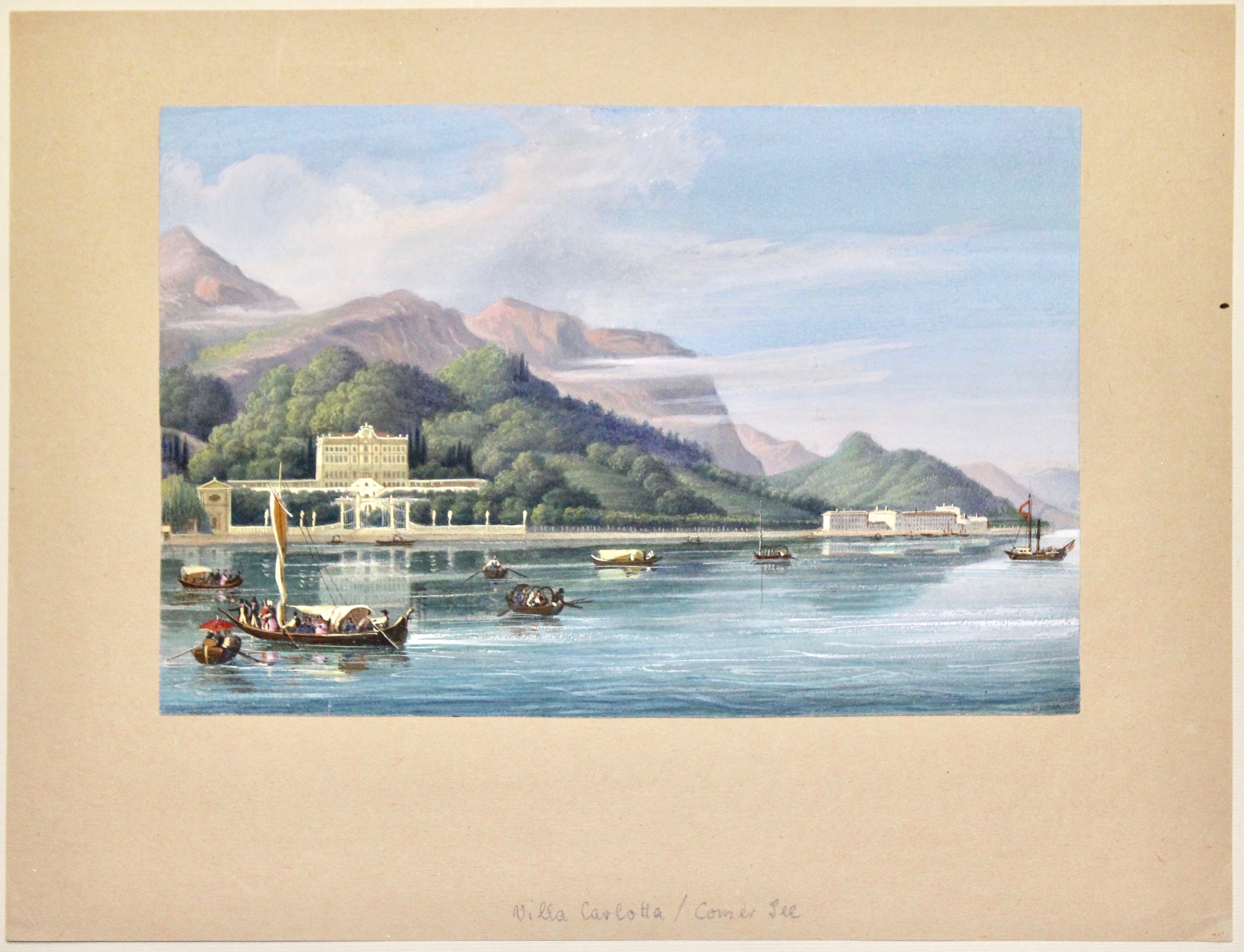 Litografia, mm 159x240, eseguita su disegno di Lose, litografata da Brisone Corbetta, magnificamente dipinta a mano d’epoca a tempera. La scena è animata, in primo piano, da numerose imbarcazioni da diporto che testimoniano l'interesse turistico per questo ameno tratto di lago. Sulla destra si scorge il battello a vapore. Sopraffina la coloritura coeva che si distingue per la pregevole attenzione ai particolari. L'incisione si presenta rifilata ed applicata editorialmente su supporto cartaceo coevo. Interessante notare come questa stampa faccia parte delle prime vedute della serie "ITALIA" edite dalla vedova Vallardi di cui al verso nell'angolo in basso a sinistra si scorge il timbro "Milano Vedova Vallardi S. Margherita N. 1118". Molto rara, non menzionata nella bibliografia di riferimento.
