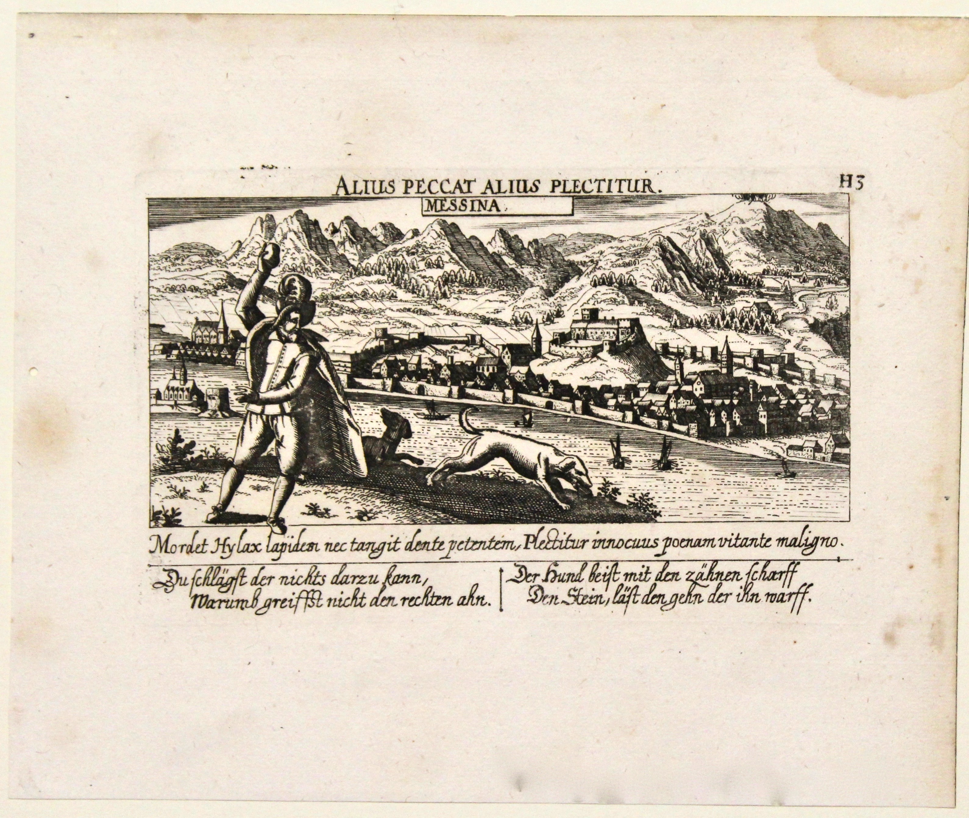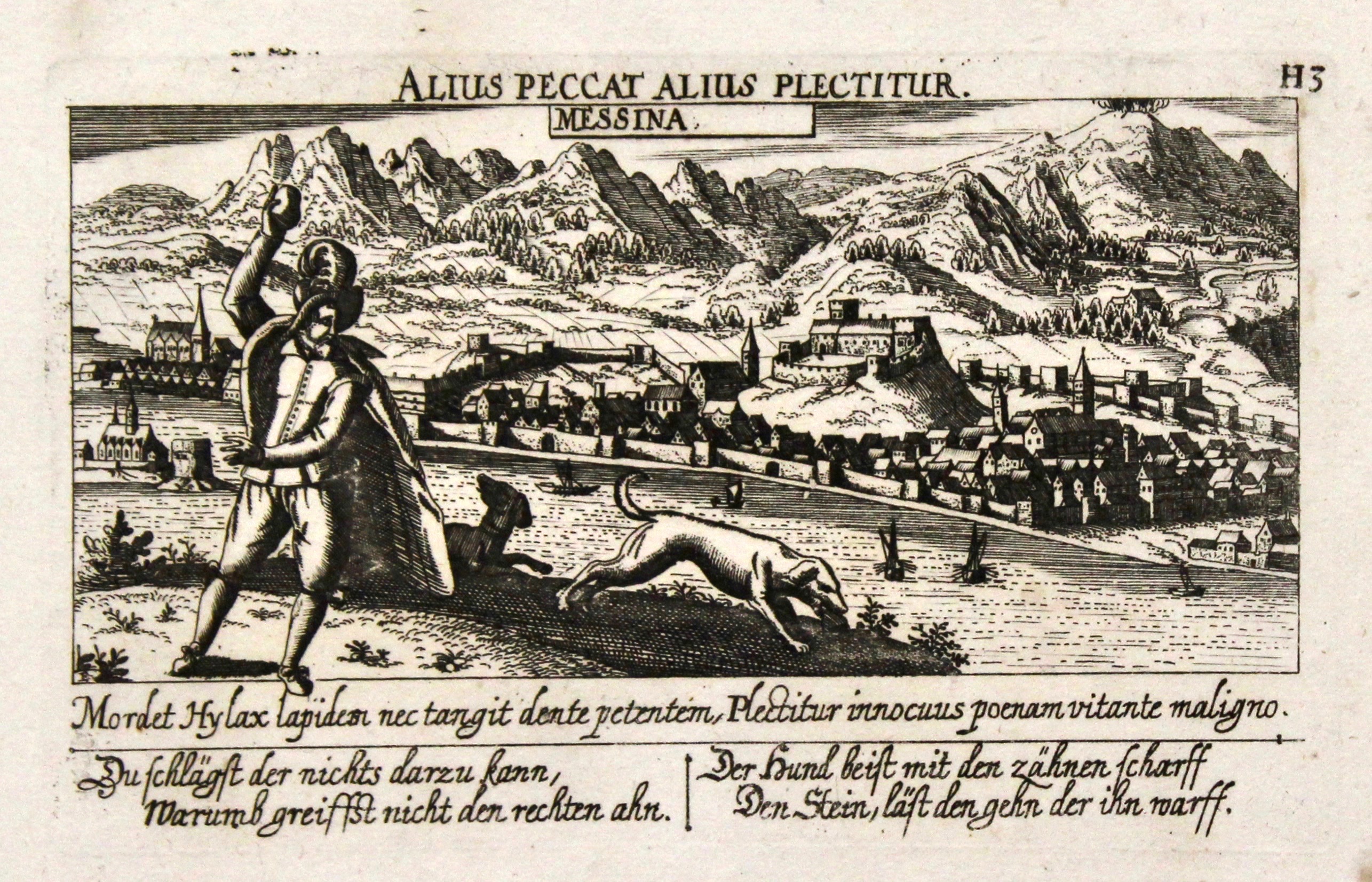 Incisione in rame, mm 90x148. Bella veduta generale della città con scena animata in primo piano, tratta da “Sciographia cosmica” e “Thesaurus philopoliticus”. Ottimo esemplare ben impresso ad ampi margini.