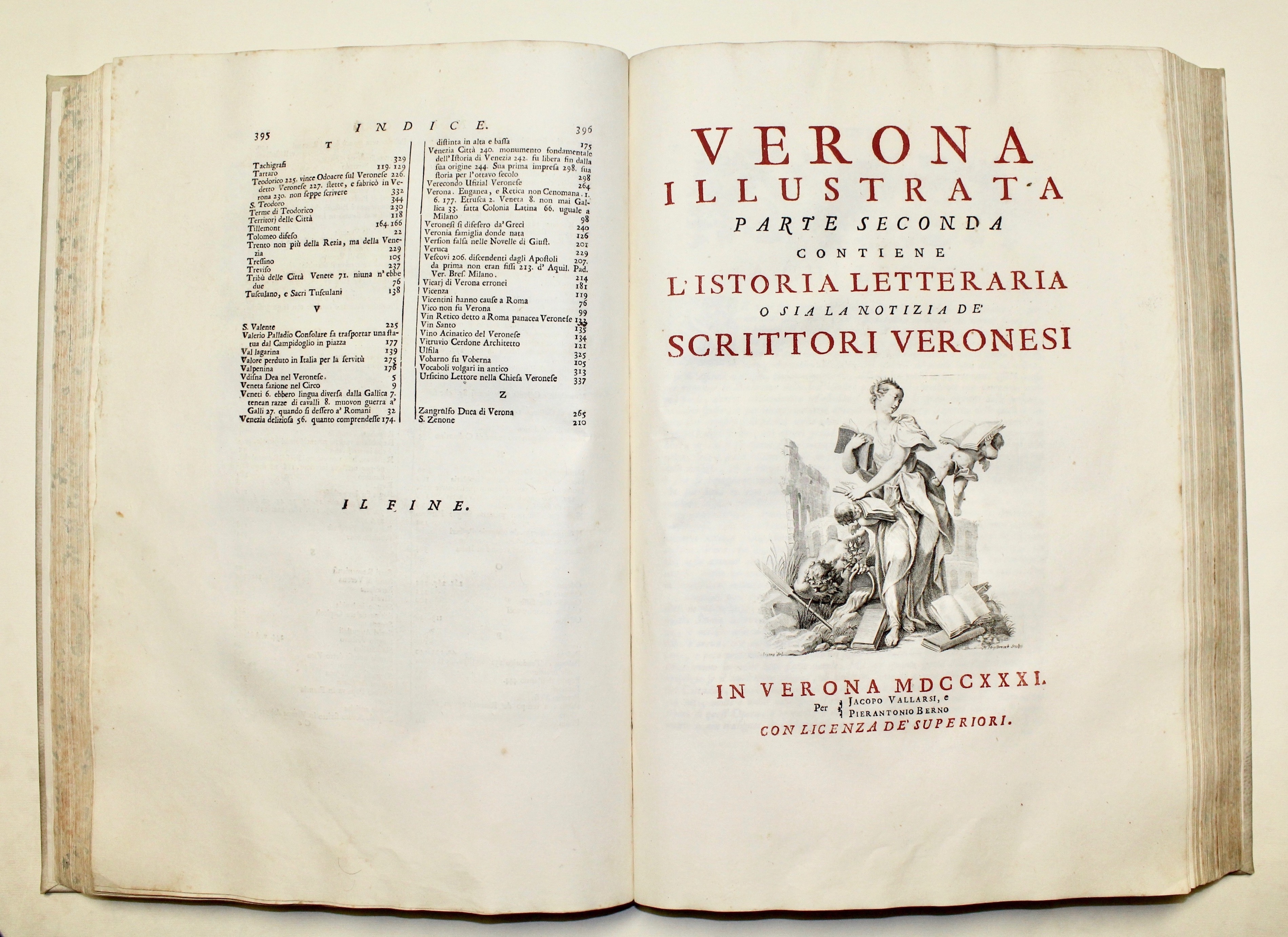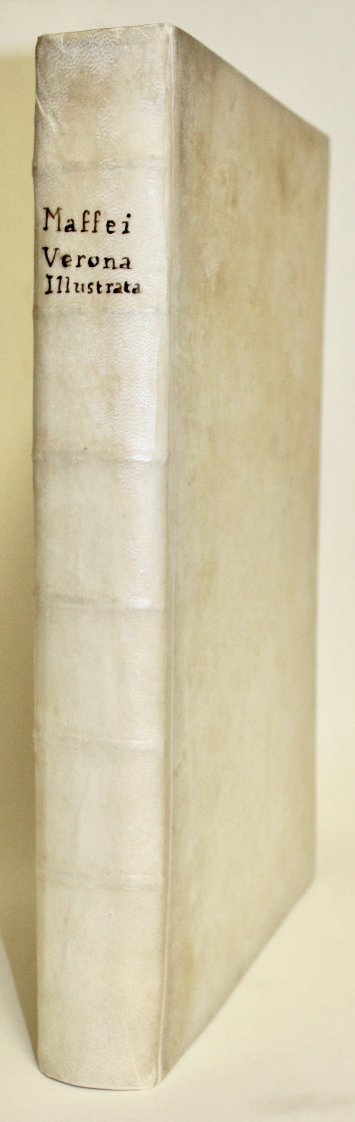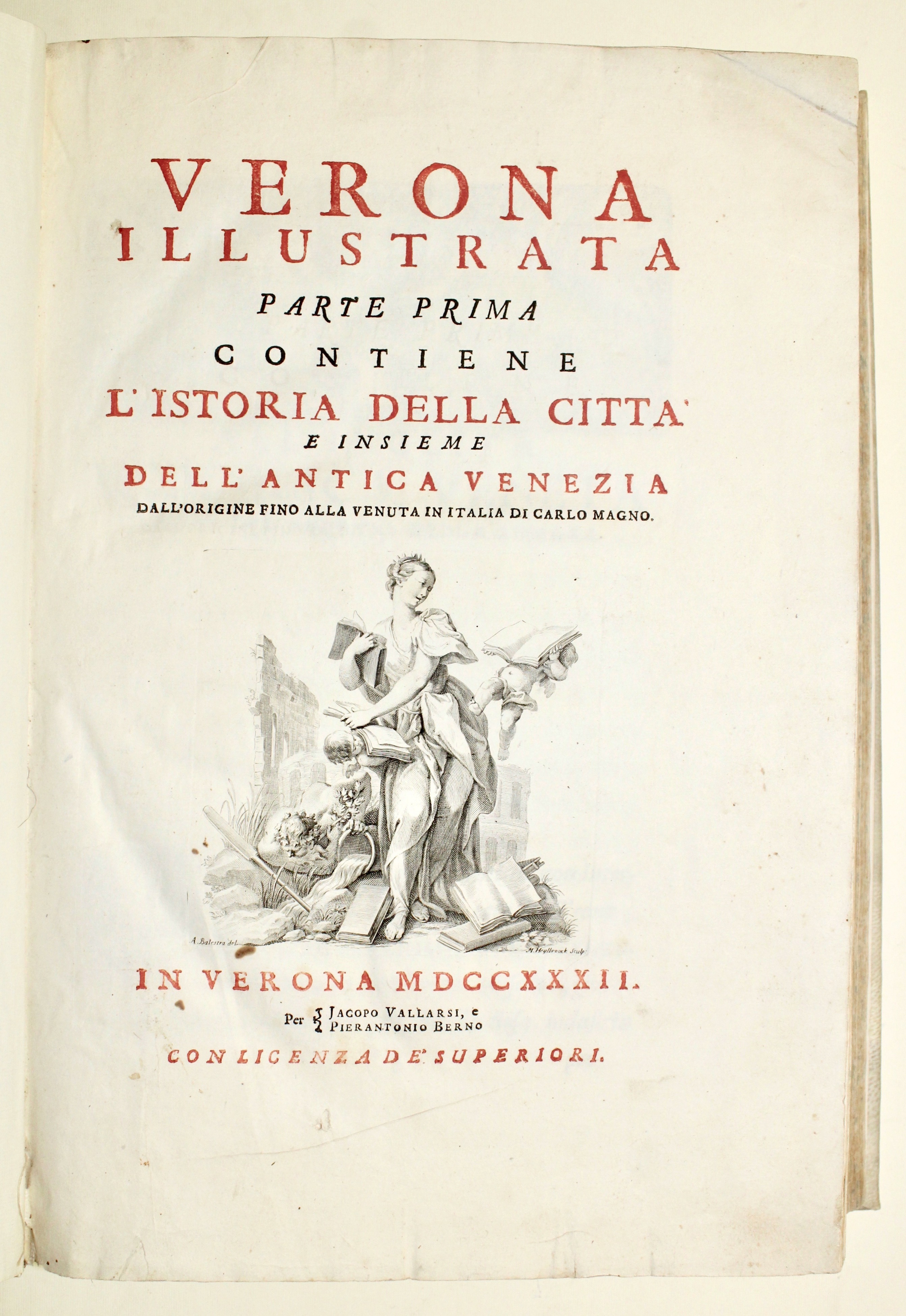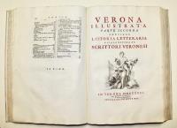 Edizione originale della più importante opera storica sulla città, frutto dello studio sistematico del maggiore erudito veronese del Settecento, figura di spicco in campo nazionale, per l’importanza dei suoi studi non solo storici e locali, ma anche nei campi di archeologia, paleografia, teatro, nonché economico e scientifico: scrisse infatti sui fulmini, sull’impiego del denaro e suo prestito, sulla magia caratterizzando sempre le sue opere di grande modernità e critica nei confronti delle tradizioni stantie, spesso prendendo posizione contro la Chiesa. La prima edizione fu pubblicata in tre varianti tipografiche: in folio, due volumi in quarto e quattro volumi in ottavo; con le medesime incisioni rimodellando ovviamente l’impianto tipografico.
