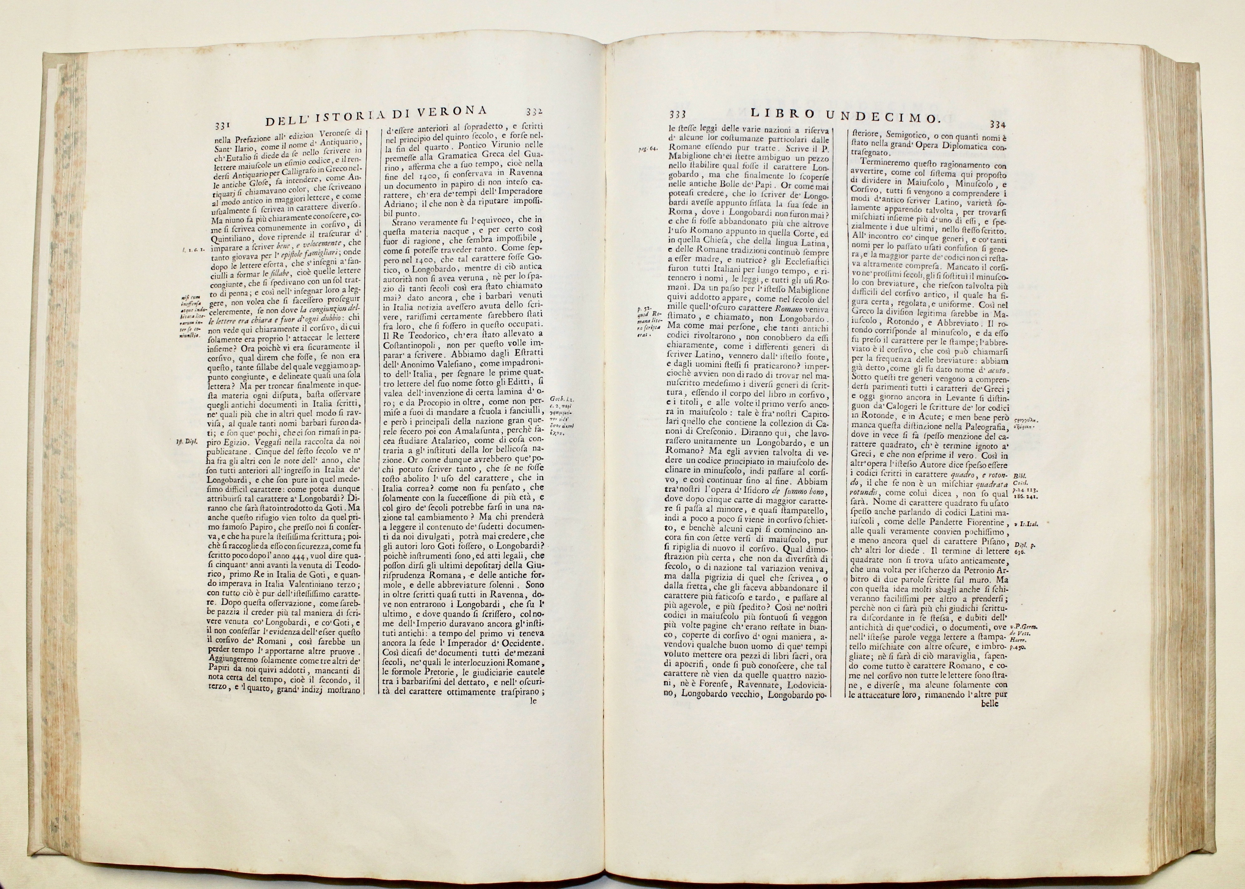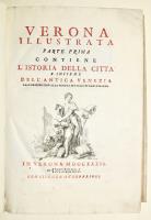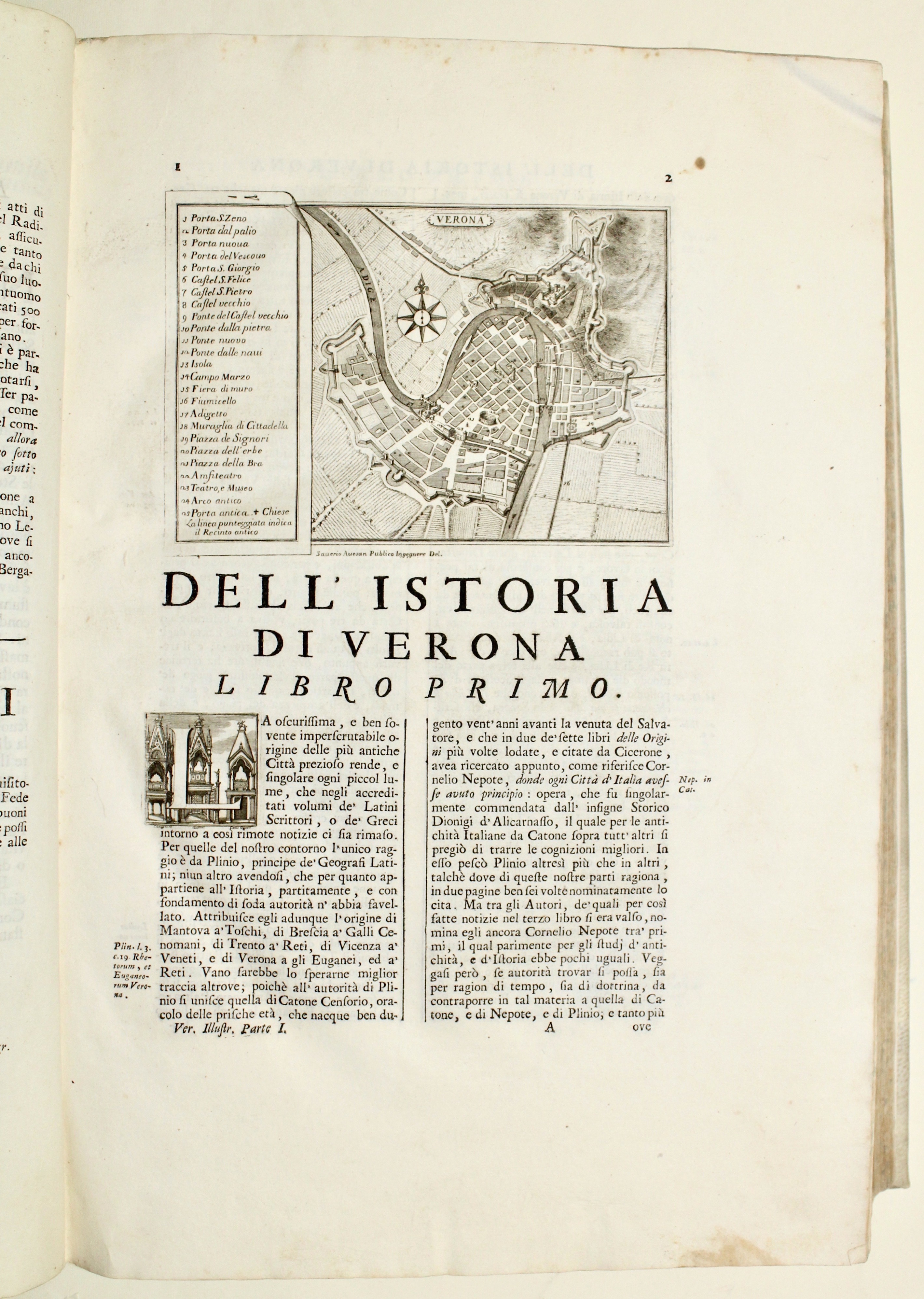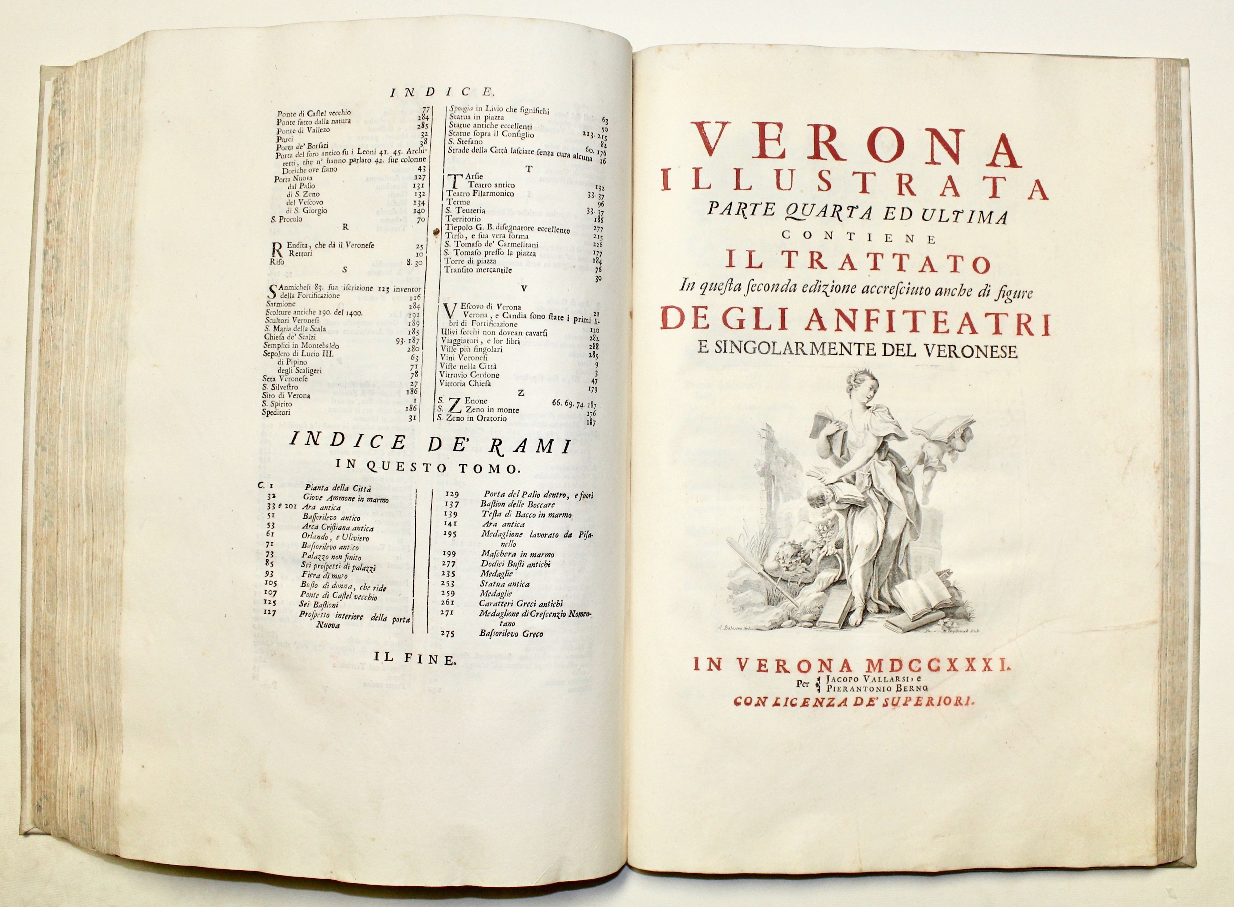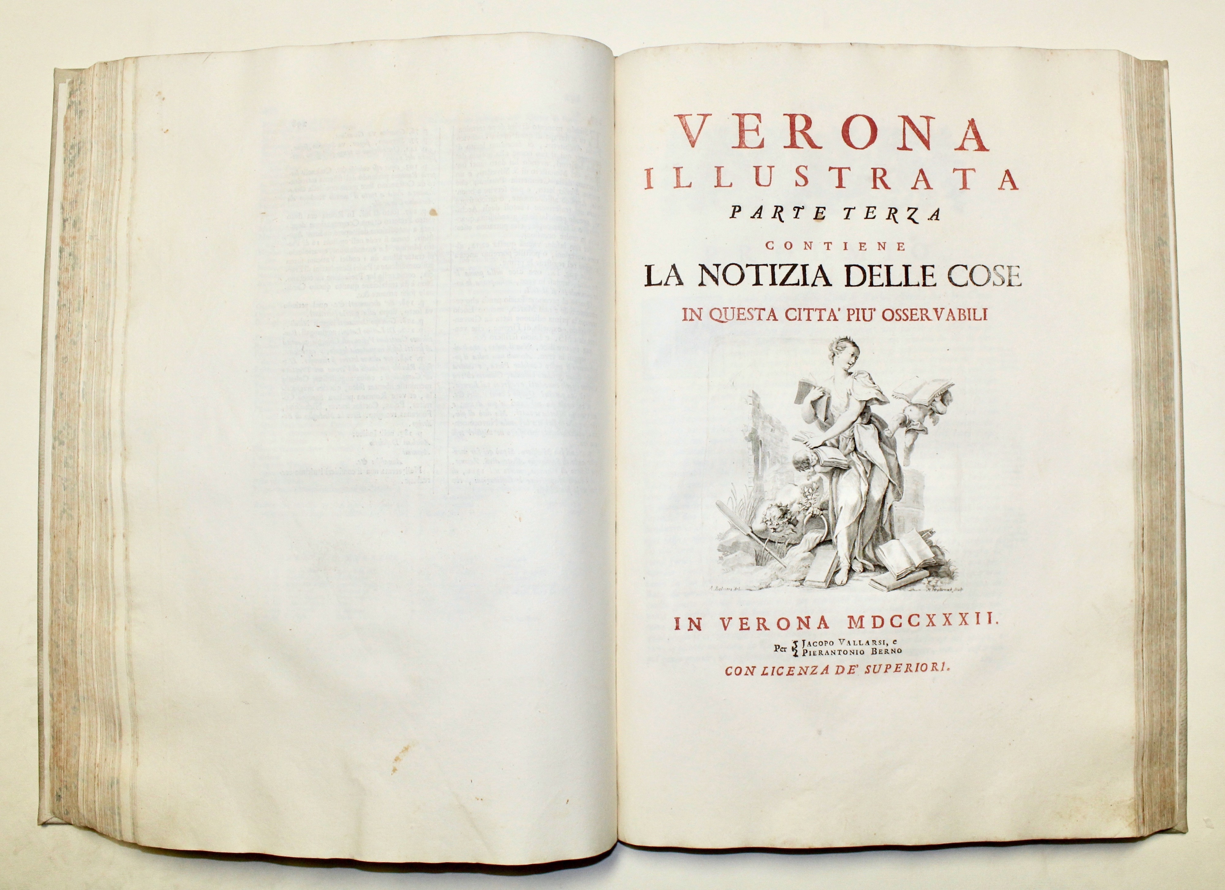 Edizione originale della più importante opera storica sulla città, frutto dello studio sistematico del maggiore erudito veronese del Settecento, figura di spicco in campo nazionale, per l’importanza dei suoi studi non solo storici e locali, ma anche nei campi di archeologia, paleografia, teatro, nonché economico e scientifico: scrisse infatti sui fulmini, sull’impiego del denaro e suo prestito, sulla magia caratterizzando sempre le sue opere di grande modernità e critica nei confronti delle tradizioni stantie, spesso prendendo posizione contro la Chiesa. La prima edizione fu pubblicata in tre varianti tipografiche: in folio, due volumi in quarto e quattro volumi in ottavo; con le medesime incisioni rimodellando ovviamente l’impianto tipografico.
