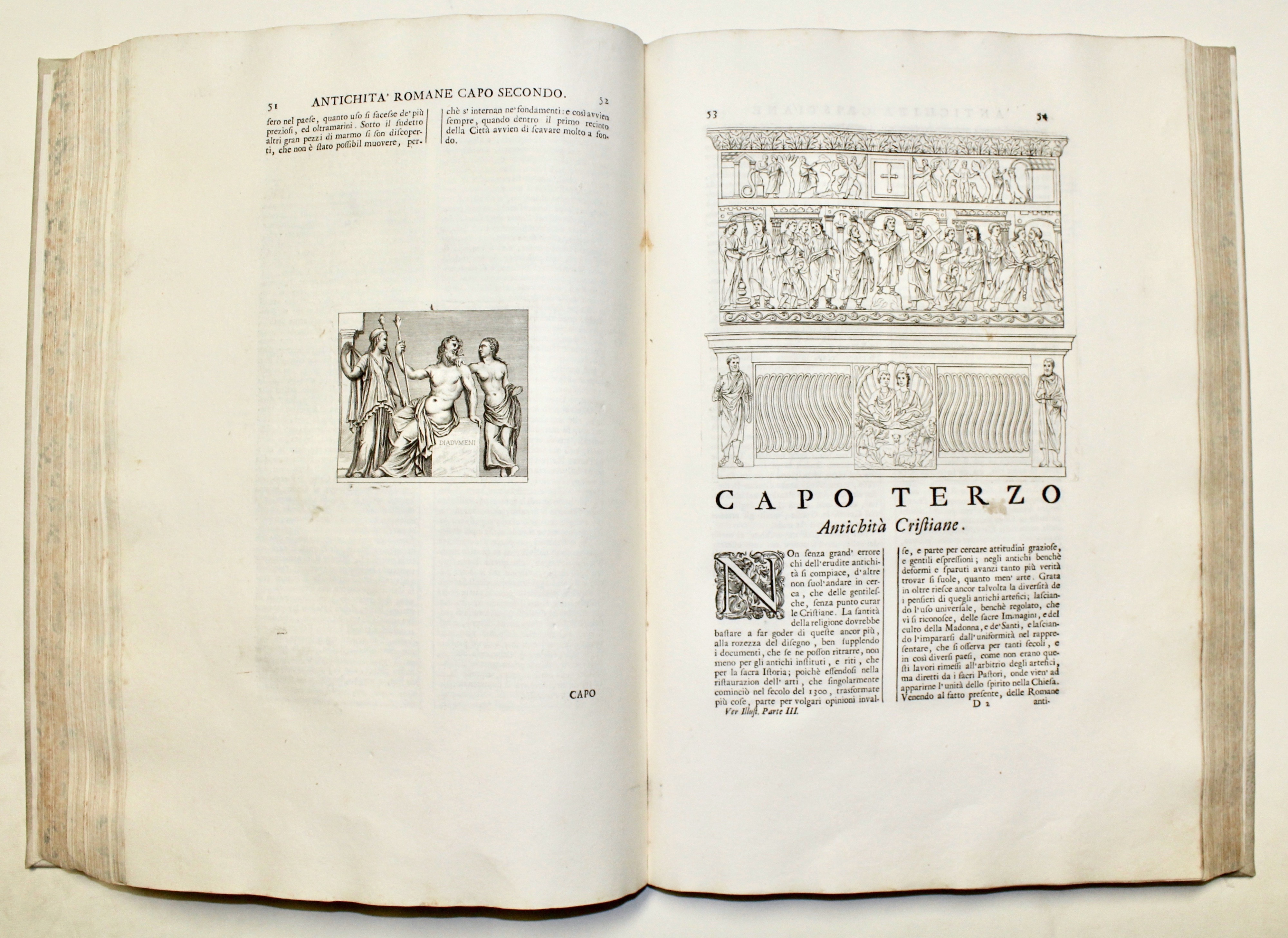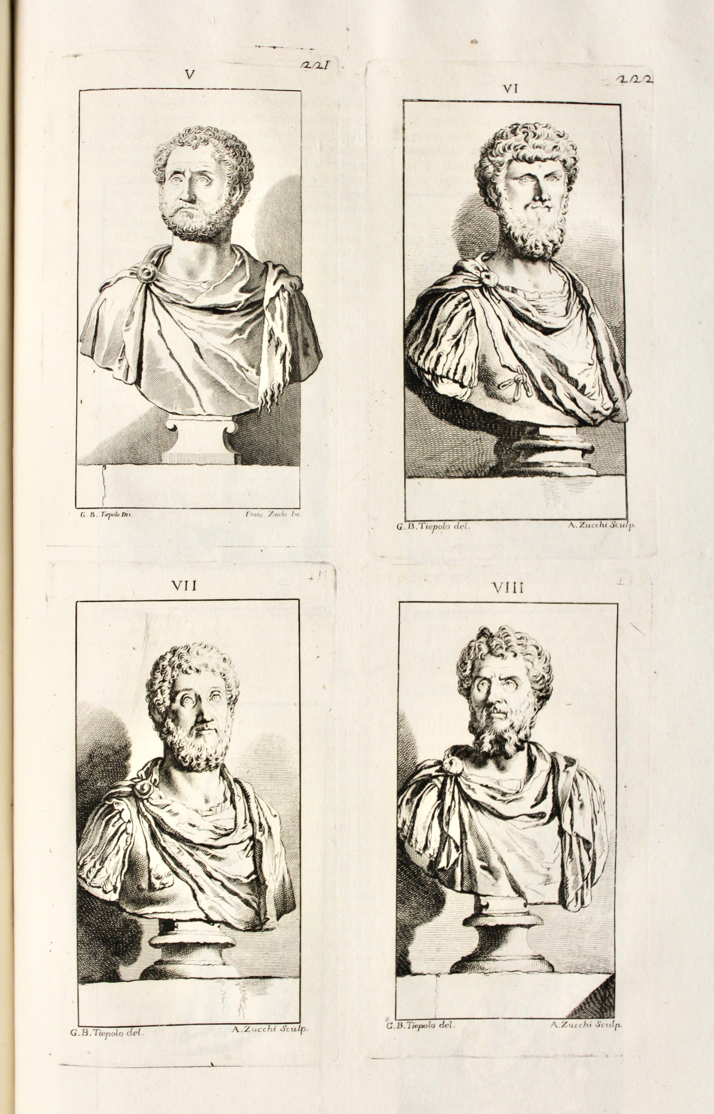 In Folio (mm 435x29), 4 parti (di cui la seconda è stampata nel 1731), ognuna con proprio frontespizio: pagg. XI, (1), colonne 396, pag. 2 che riportano le “Giunte” e l’”Errata”; pag. X, col. 298; pagg. IV, col. 294, pagg. (3); pagg. (4), col. 214, (1 pag. bianca), (2 pagine di aggiunte al testo). Vignetta ai frontespizi, tutti stampati in rosso e nero, inc. da M. Heylbrouck su disegno di Antonio Balestra, 67 incisioni in rame nel testo (di cui una a piena pagina) di F. Zucchi, raffiguranti i 12 busti antichi disegnati da Giambattista Tiepolo, fregi, monete, monumenti, epigrafi, sculture, iniziali ornate, fregi ed iniz. silografiche.