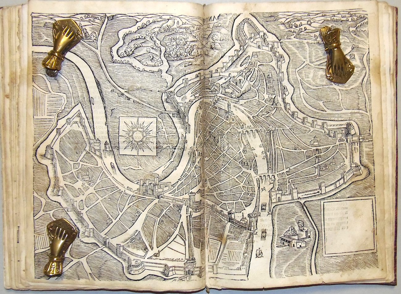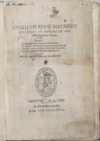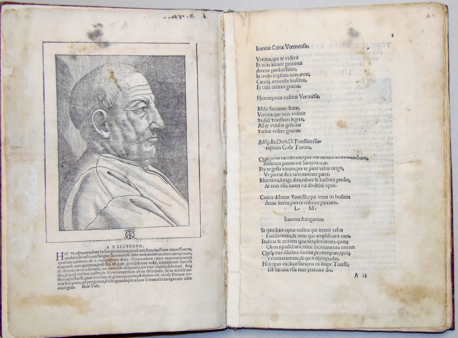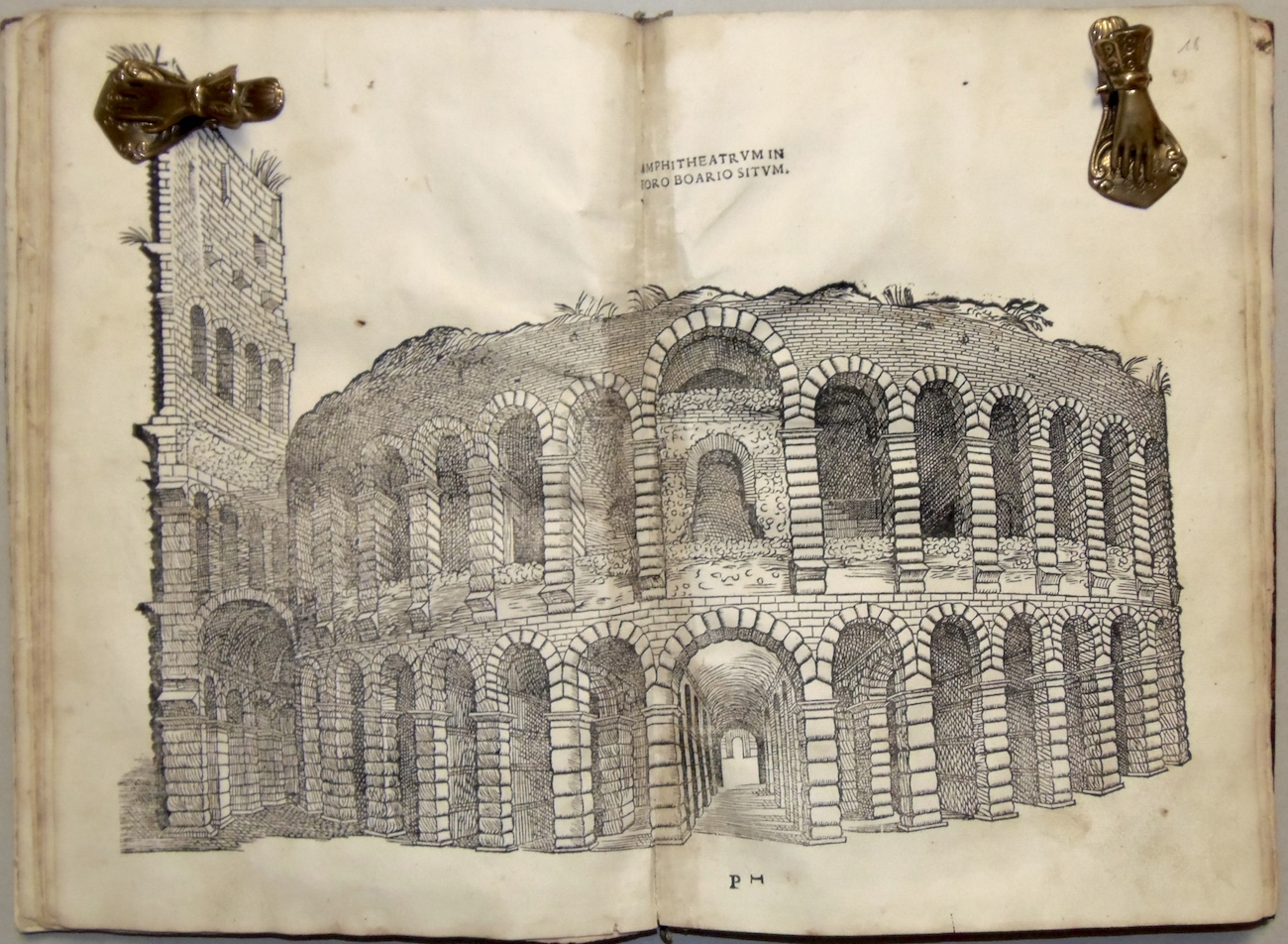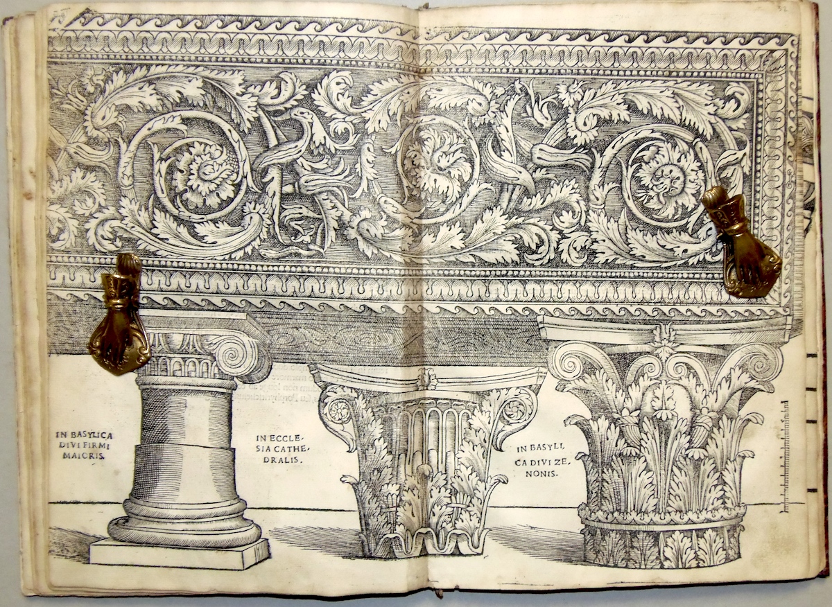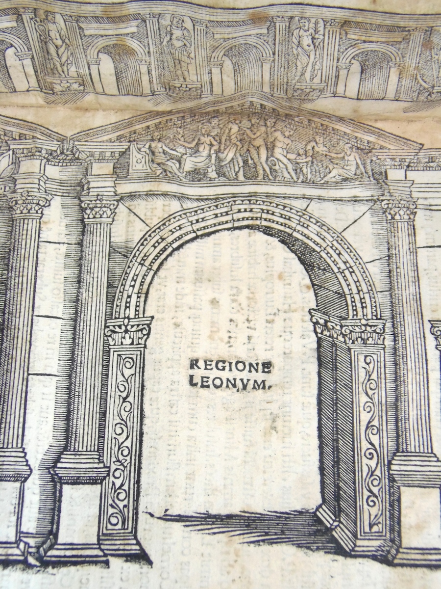 Folio piccolo; carte 70 mal numerate ed una grande tavola silografica a quadruplo foglio più volte ripiegata, raffigurante il teatro romano; ritratto dell'autore al verso del frontespizio, 29 grandi silografie perlopiù a piena o doppia pagina. Legatura in mezza pelle ottocentesca con filettini dorati. Rara edizione originale di una delle prime opere di architettura relativa alle antichità di una città minore. Le illustrazioni sono di Giovanni Caroto, pittore veronese e raffigurano archi e antichità romane, fra cui l'anfiteatro ed il teatro. Esemplare nel complesso discretamente conservato e completo della grande tavola, quasi sempre mancante: l'opera è difficilmente in condizioni perfette. Presenta numerosi piccoli difetti, generalmente un po' vissuto, con alone d'umido, qualche carta un po' rifilata, alcuni piccoli restauri di vario genere, rilegato con utilizzo anche di materiale antico di provenienza liturgica al marg. int., qualche mancanza, evidente alla grande tavola ripiegata, restauro al dorso. Adams S-393; Cicognara 4089; Lozzi II-6323; Fowler 289.