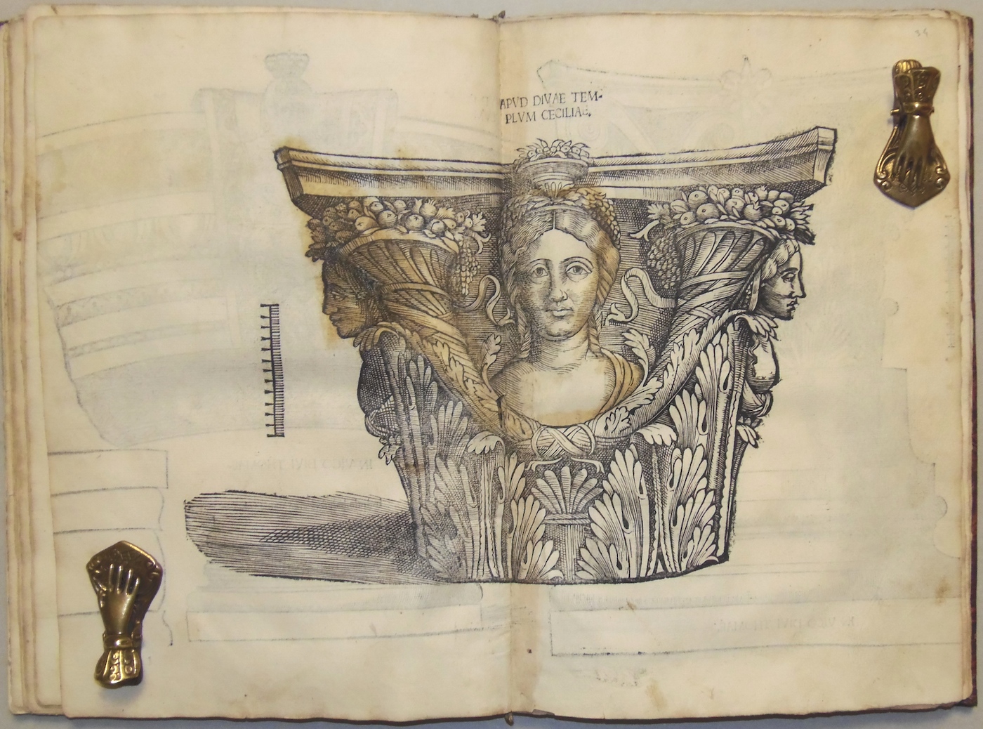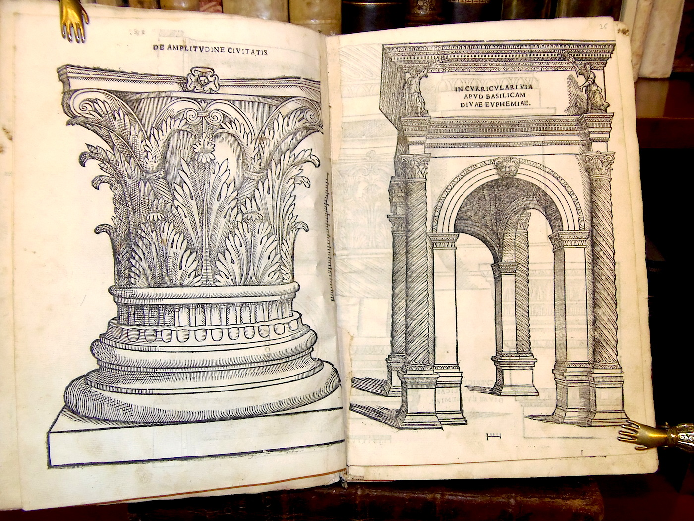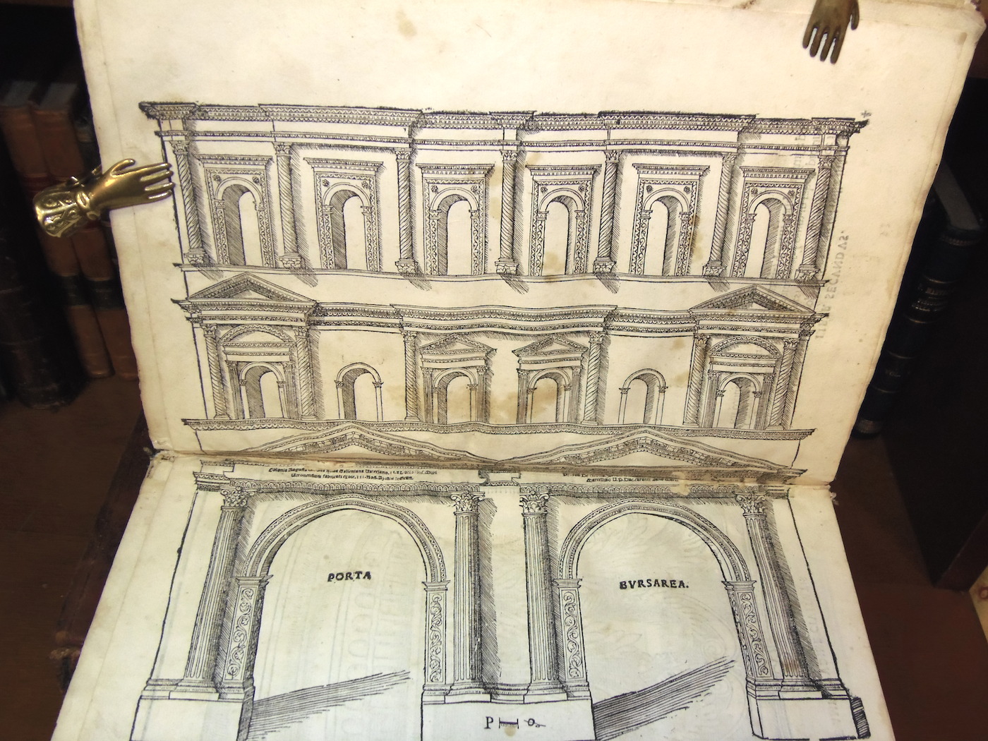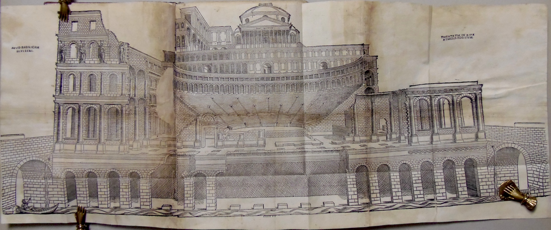 Folio piccolo; carte 70 mal numerate ed una grande tavola silografica a quadruplo foglio più volte ripiegata, raffigurante il teatro romano; ritratto dell'autore al verso del frontespizio, 29 grandi silografie perlopiù a piena o doppia pagina. Legatura in mezza pelle ottocentesca con filettini dorati. Rara edizione originale di una delle prime opere di architettura relativa alle antichità di una città minore. Le illustrazioni sono di Giovanni Caroto, pittore veronese e raffigurano archi e antichità romane, fra cui l'anfiteatro ed il teatro. Esemplare nel complesso discretamente conservato e completo della grande tavola, quasi sempre mancante: l'opera è difficilmente in condizioni perfette. Presenta numerosi piccoli difetti, generalmente un po' vissuto, con alone d'umido, qualche carta un po' rifilata, alcuni piccoli restauri di vario genere, rilegato con utilizzo anche di materiale antico di provenienza liturgica al marg. int., qualche mancanza, evidente alla grande tavola ripiegata, restauro al dorso. Adams S-393; Cicognara 4089; Lozzi II-6323; Fowler 289.