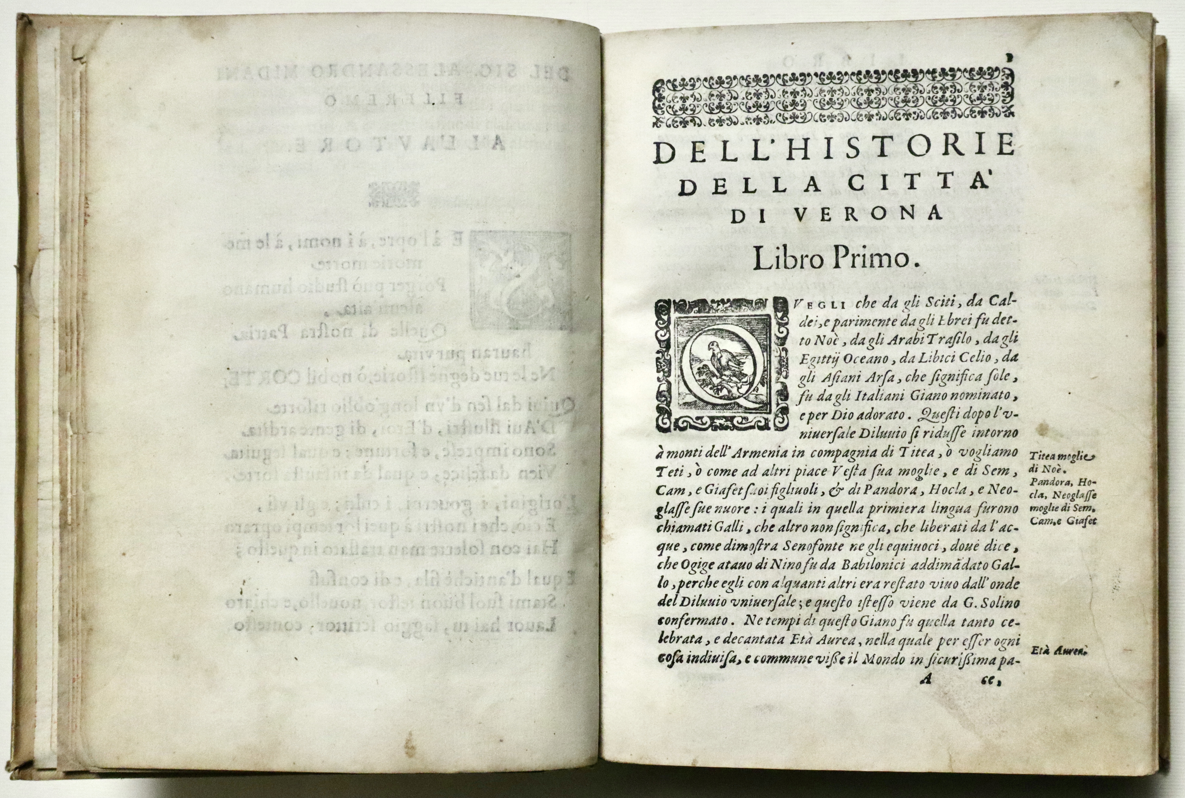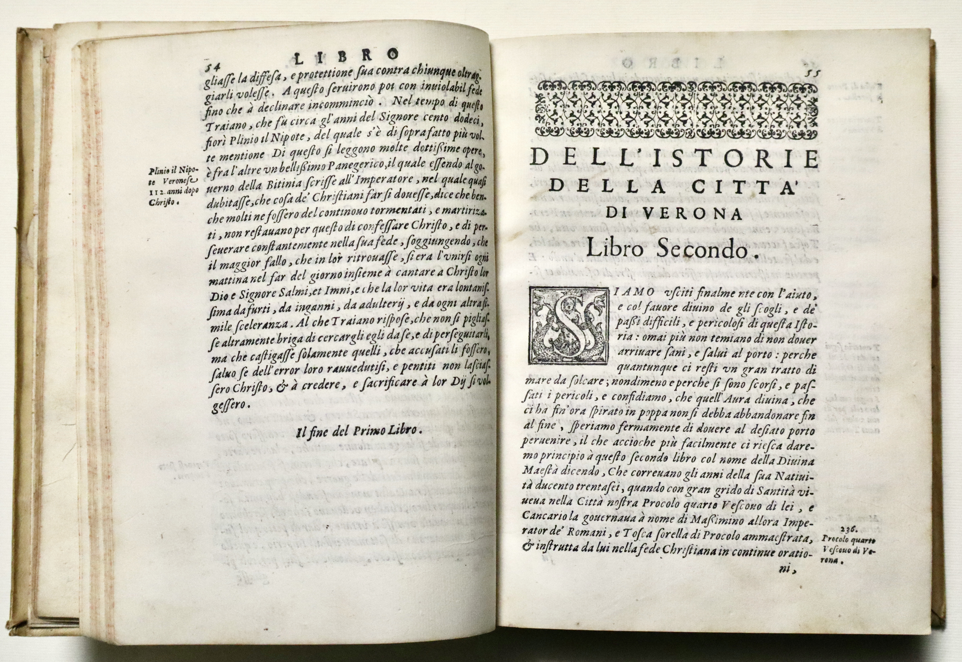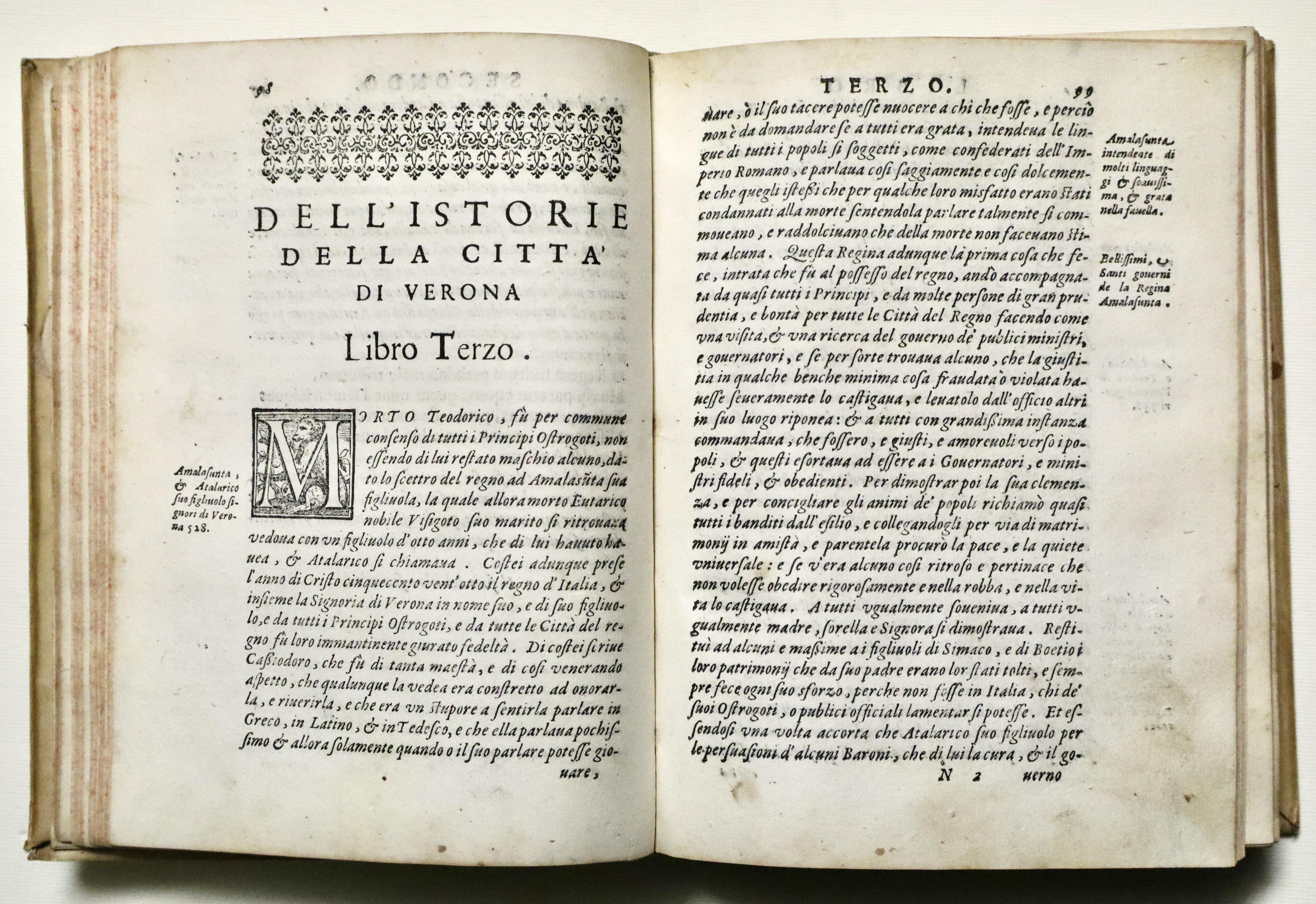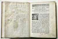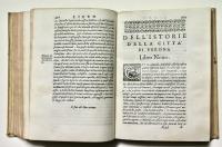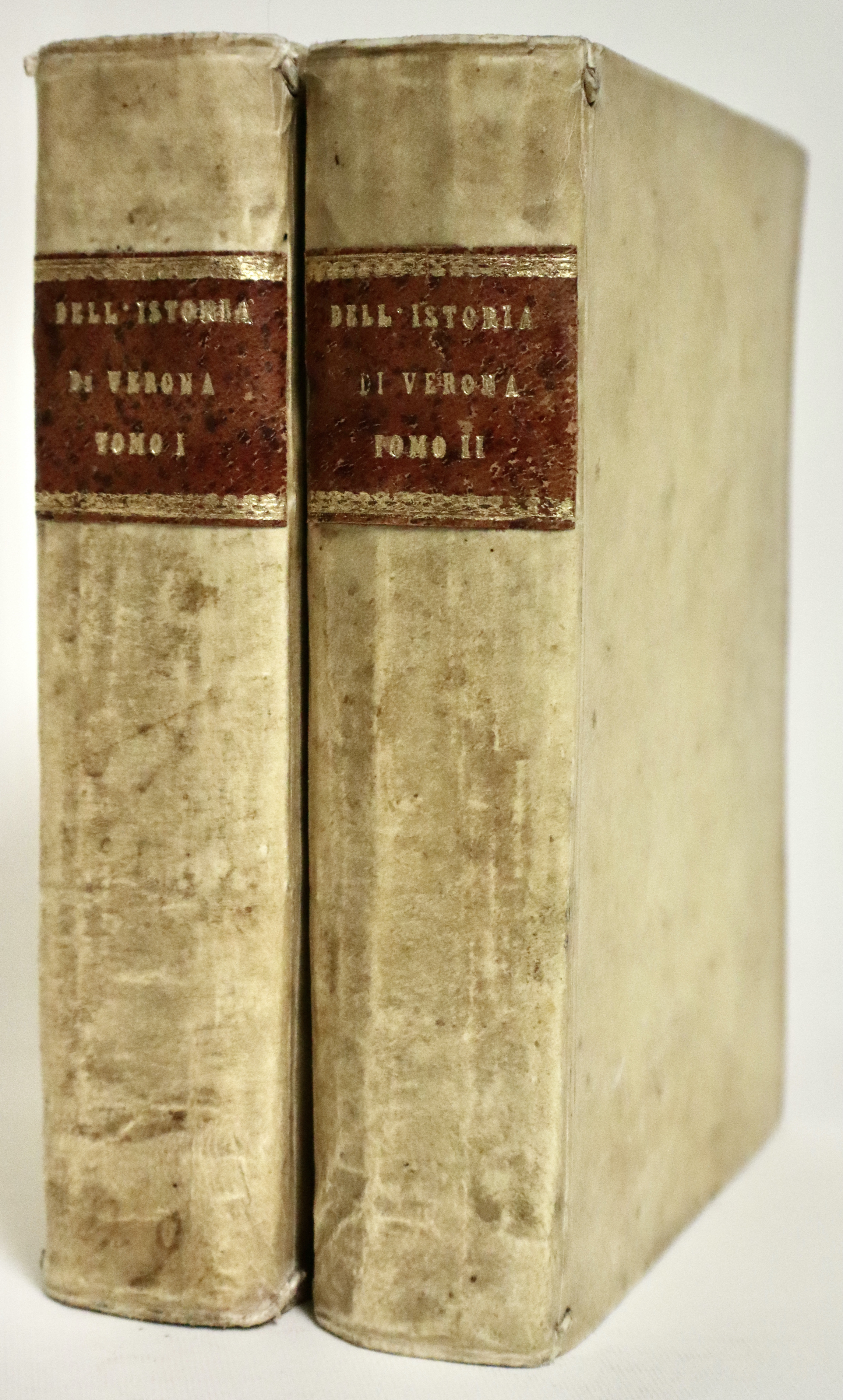 Pergamena settecentesca, tagli rossi a spruzzo, titolo in oro su tasselli in pelle nocciola, rinnovati. Nota di possesso manoscritta ai frontespizi. Nota di presentazione dell’opera dell’editore Girolamo Discepolo; egli, grande tipografo, noto per vari successi editoriali, fu prediletto dagli intellettuali e dal clero veronese e realizzò nel 1590 un eccezionale catalogo di venticinque titoli e con la sua azienda resistette per vari anni all'ipotetico isolamento della crisi generale della stampa di fine secolo: Verona continuò ad inviare libri alla fiera di Francoforte soprattutto per merito del Discepolo. La nuova Istoria di Verona di G. Della Corte, la nostra edizione, del ‘92-'94, fu così richiesta da venire ristampata già nel '96; non mancarono altri titoli di erudizione e di storia profana e sacra, o rime, o manualetti di devozione.