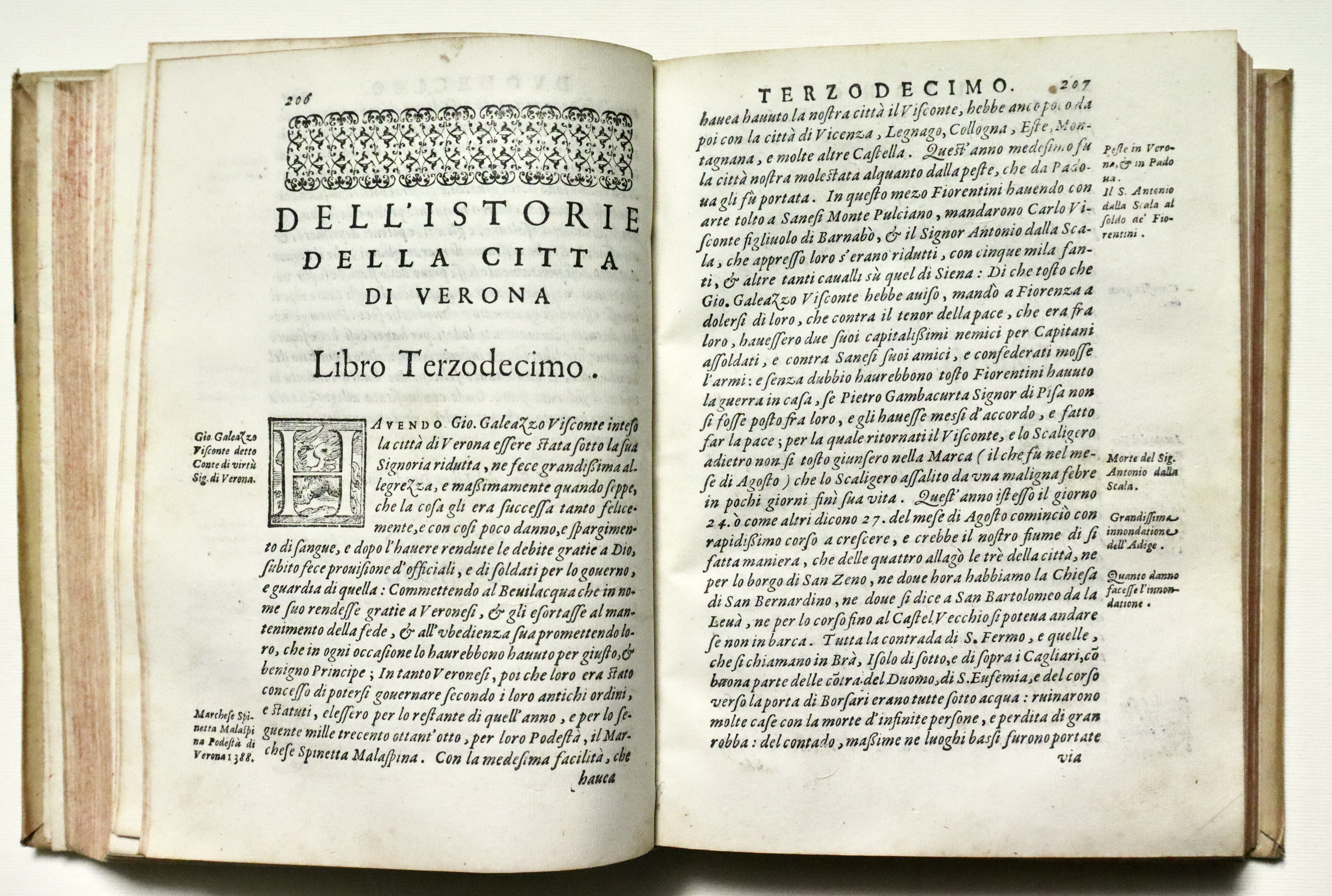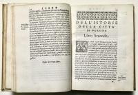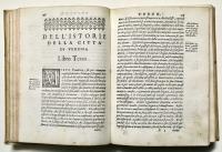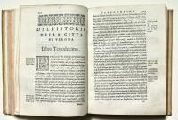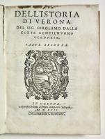 Prima edizione di una delle fondamentali storiografie della città di Verona, poi ripubblicata nel 1596. Il piano dell'opera preventivava 22 libri, ma solo i primi 20, a causa della morte del Dalla Corte, furono stampati.